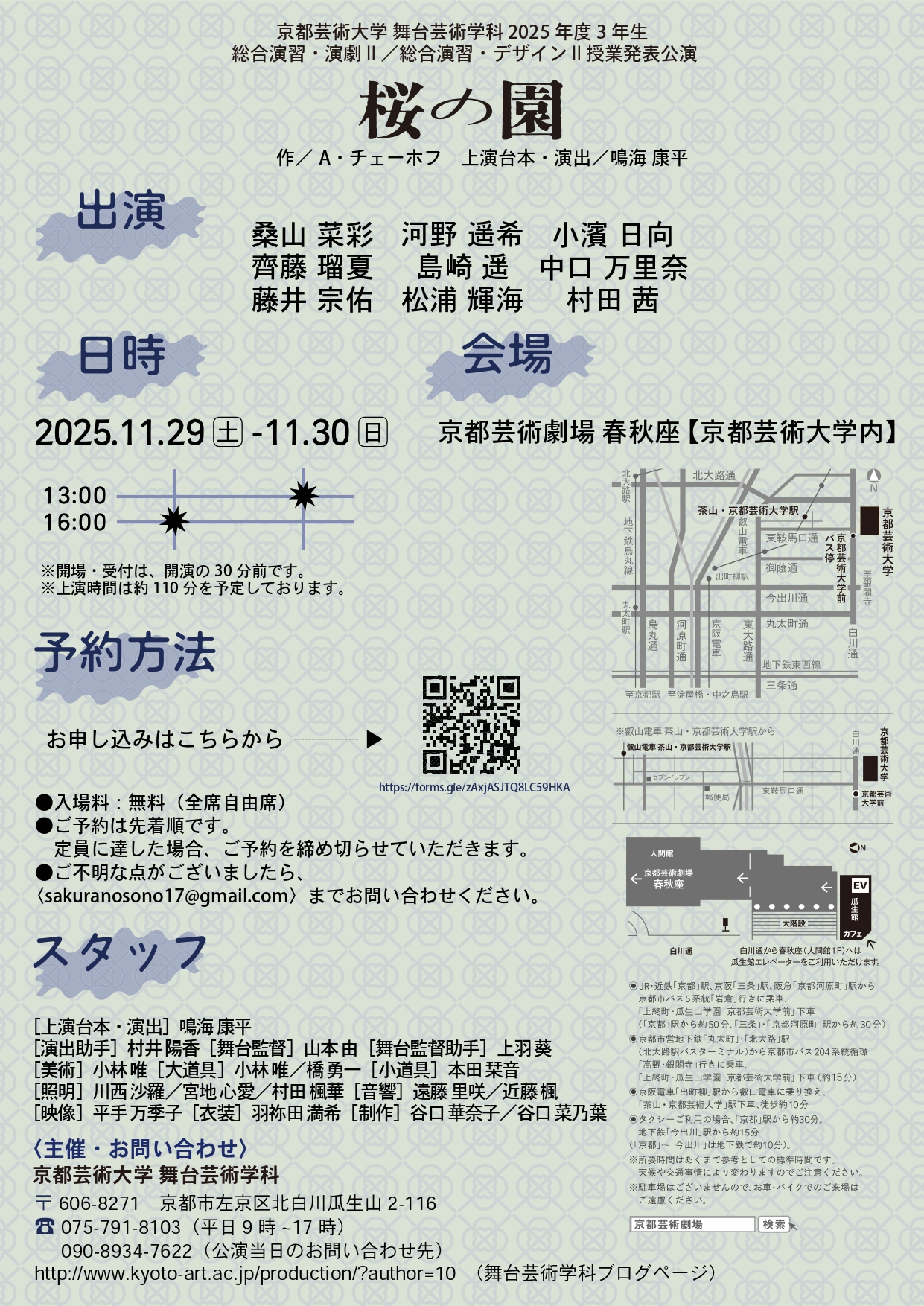 ロシアを代表する劇作家であるチェーホフが晩年に書いた『桜の園』。国内外で活動している劇団「第七劇場」の主宰である鳴海康平先生の演出のもと、演技・演出コース、舞台デザインコースの3回生が作品を作り上げます。この秋、ここでしか見られない『桜の園』をみなさまにお届けします!