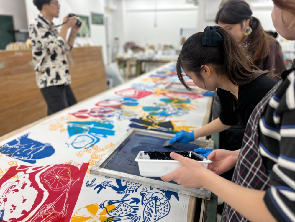 本物の染料を使って、形と色の構成で布をデザインしてみます。シルクスクリーンという印刷技法で、テキスタイル表現の魅力を体感できますよ!