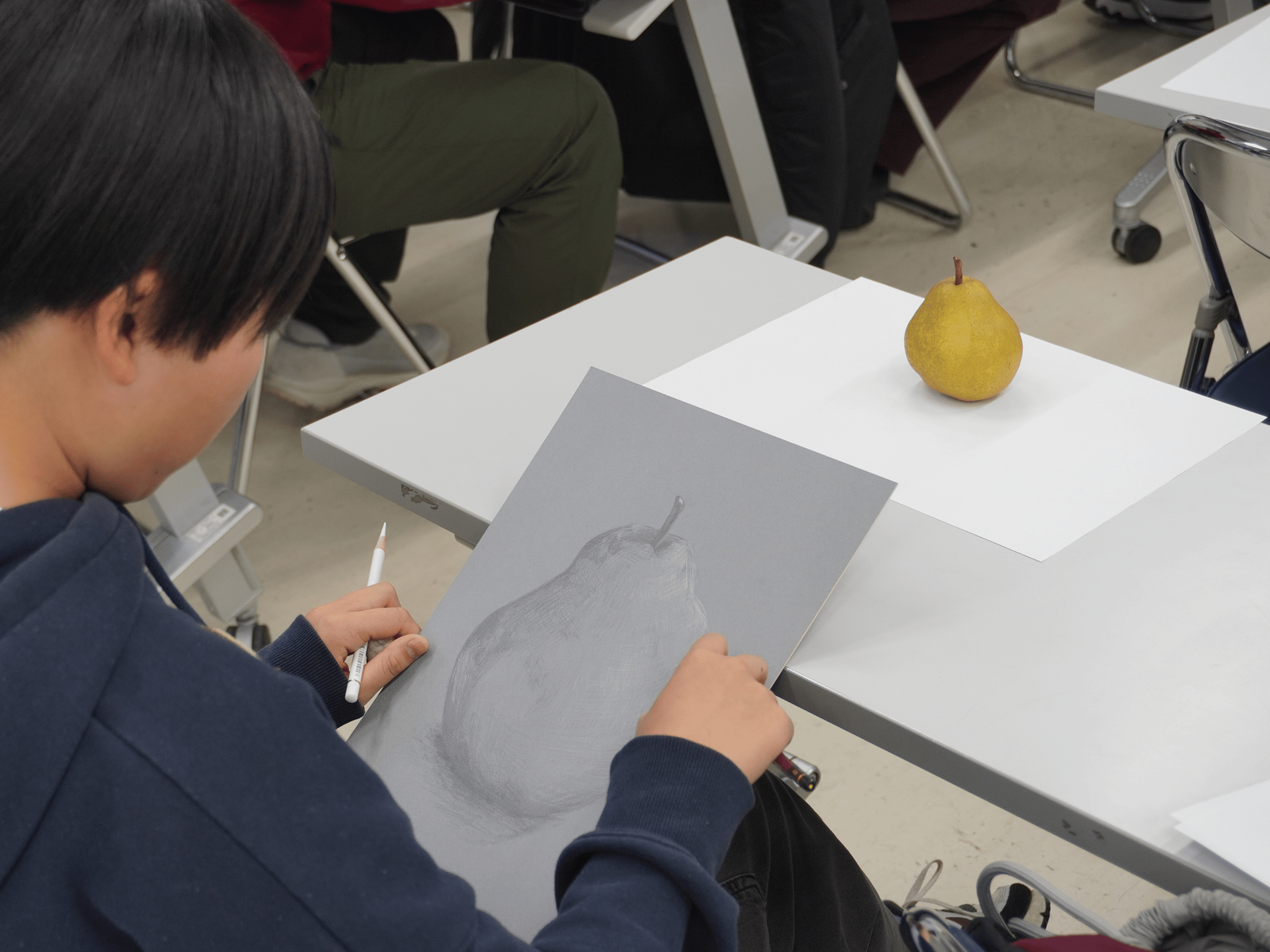 でも今回はその逆!暗い色の紙に、白い鉛筆を使って「光が当たっている部分」をすくい取っていくデッサン・ワークショップを行いました。