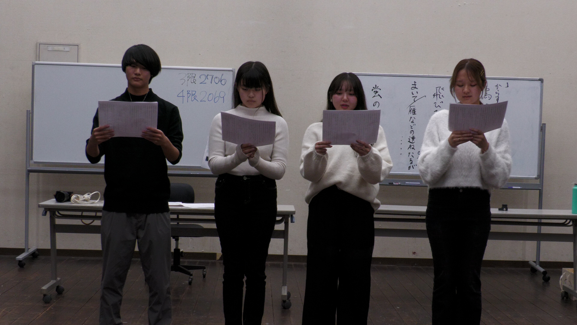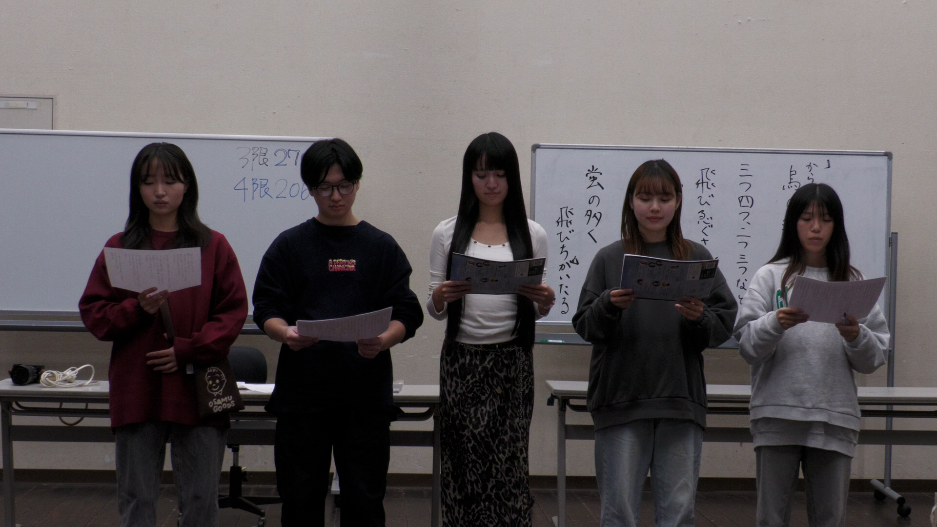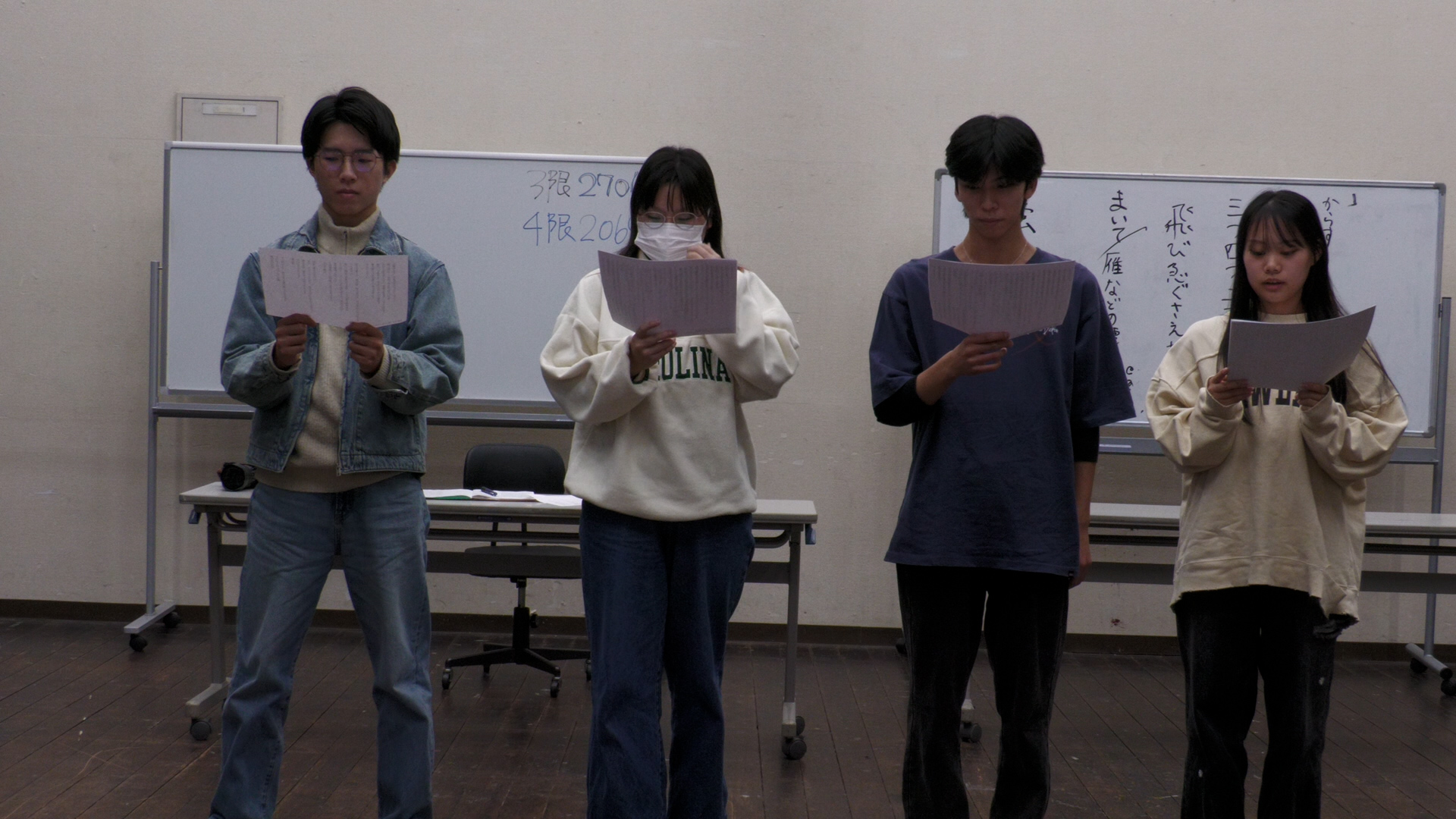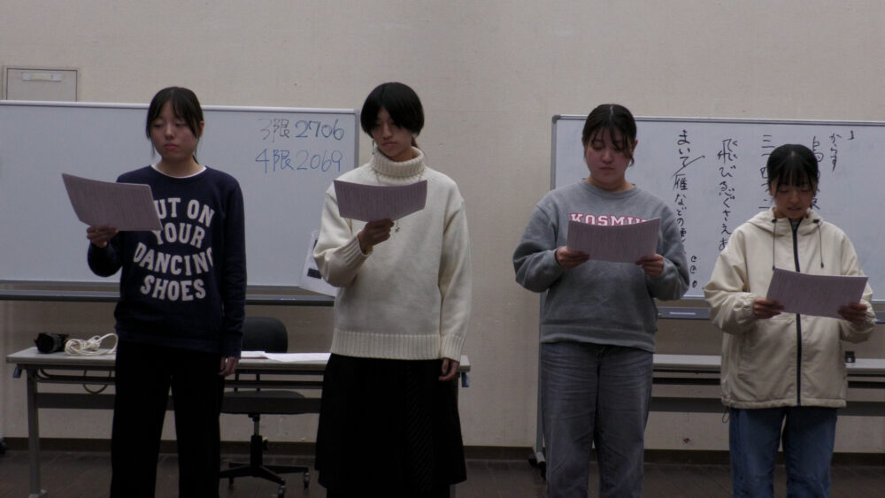 初日の11/27は、「朗読」。元フジテレビのアナウンサー・松尾翠さんを招聘し、発話やイントネーションから始まって朗読の基礎を学んでいきます。