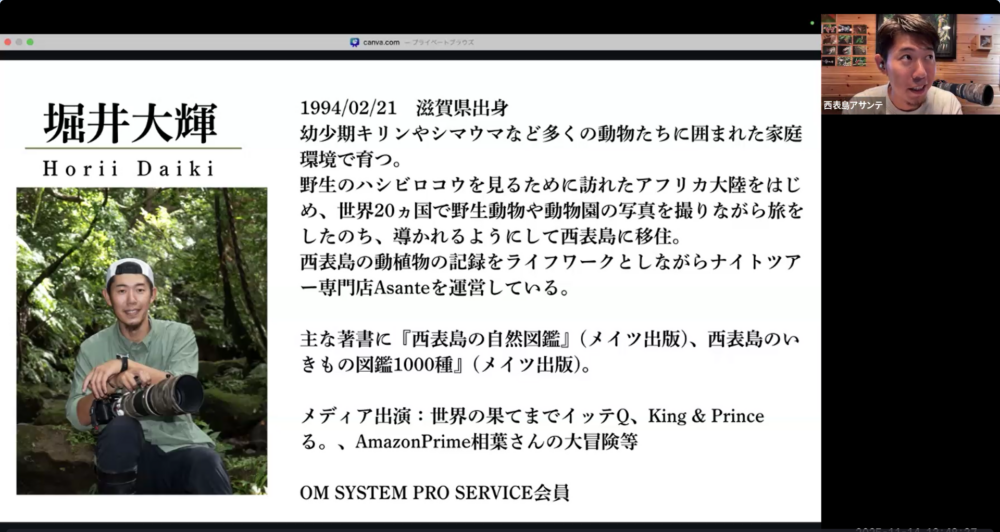 今回は、西表島ナイトツアー専門店ASANTE 代表ガイドである堀井 大輝さんをオンラインでの特別ゲストとしてお迎えして、こがくの学生や教職員に向けてご講演を実施いただきました✨