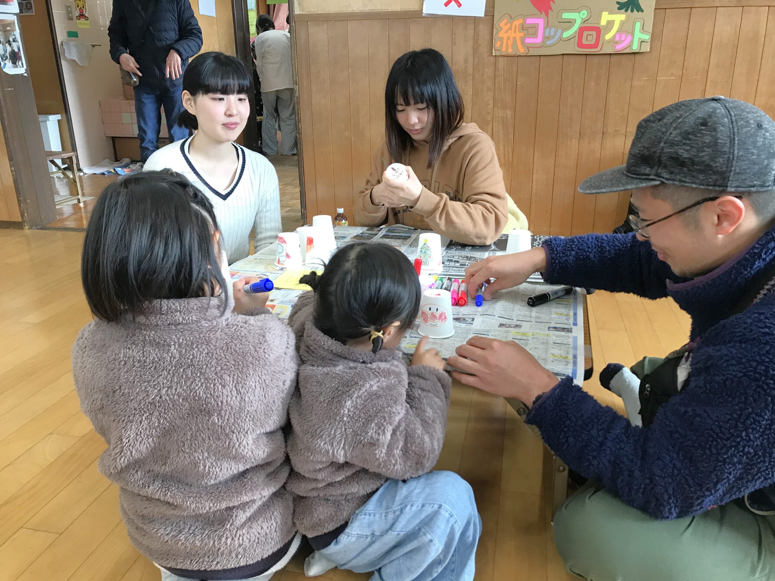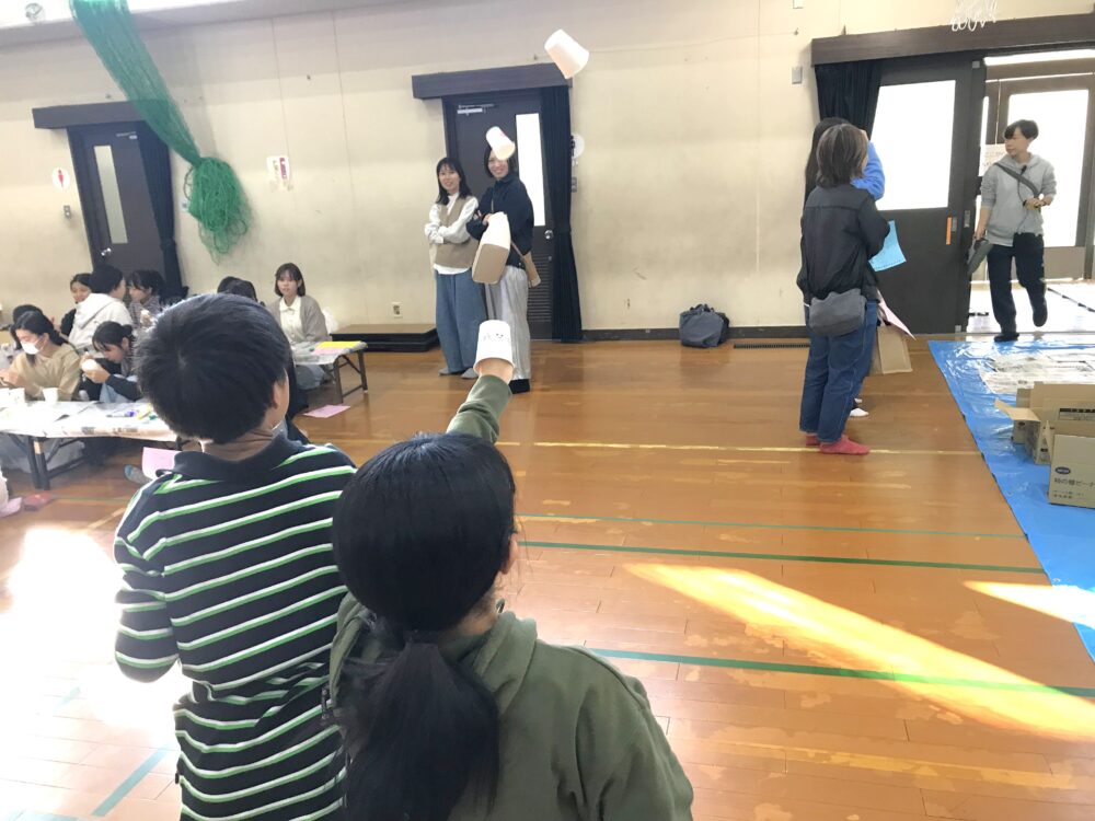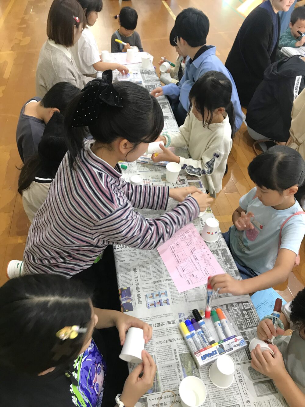 あらかじめ学生たちが片方の紙コップに輪ゴムの仕掛けを準備しておき、もう片方の紙コップには児童館の子どもたちにそれぞれ好きな絵を描いてもらいます🎨