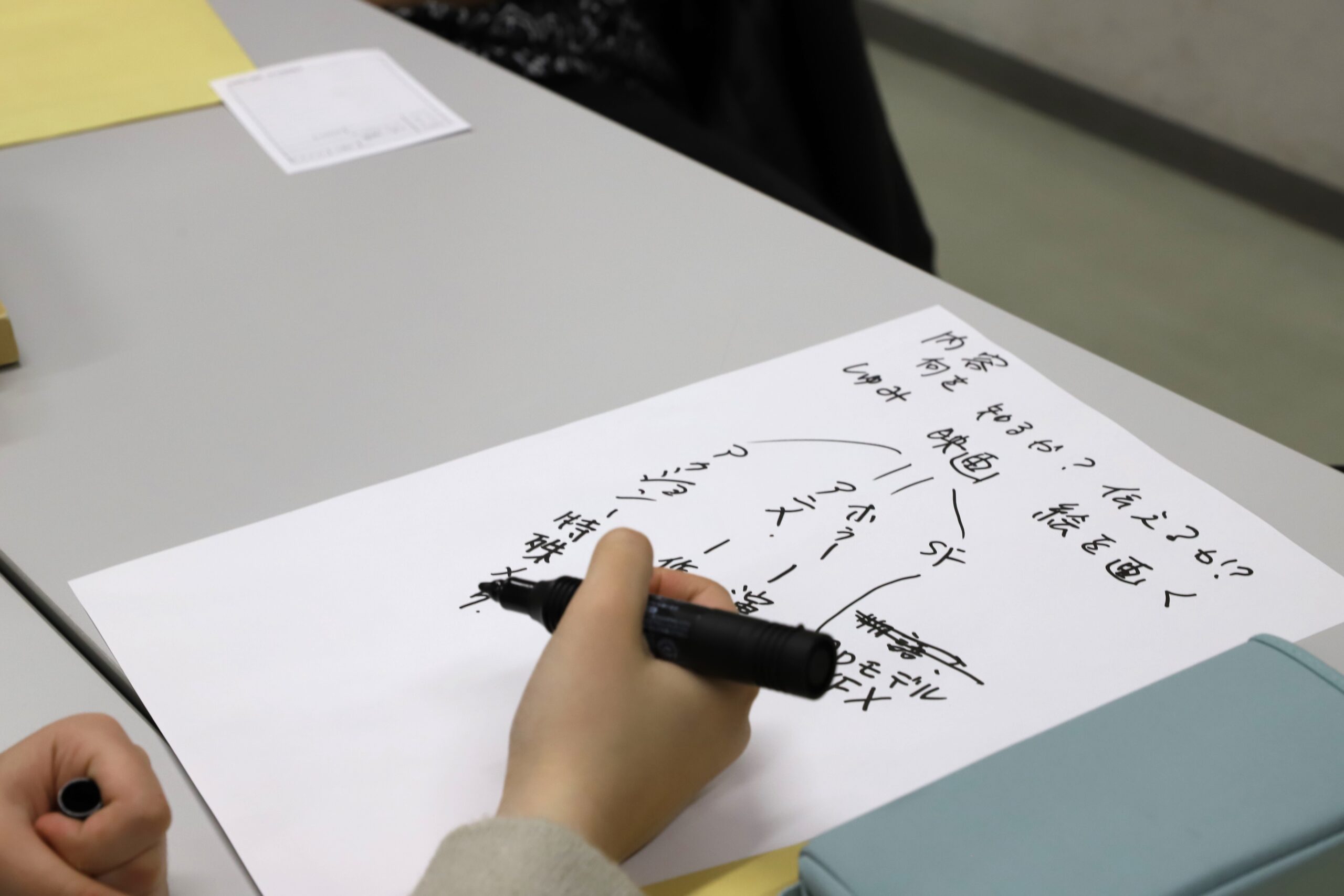 「自己紹介を企画」する…早速アートプロデュースコースらしい課題が出されましたね。4~5名ずつのグループに分かれ、何を紹介するのか(内容)、どうやって紹介するのか(方法)の2ステップで企画を考えていきます。