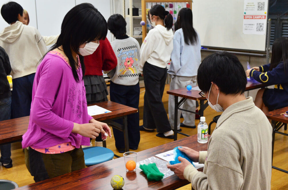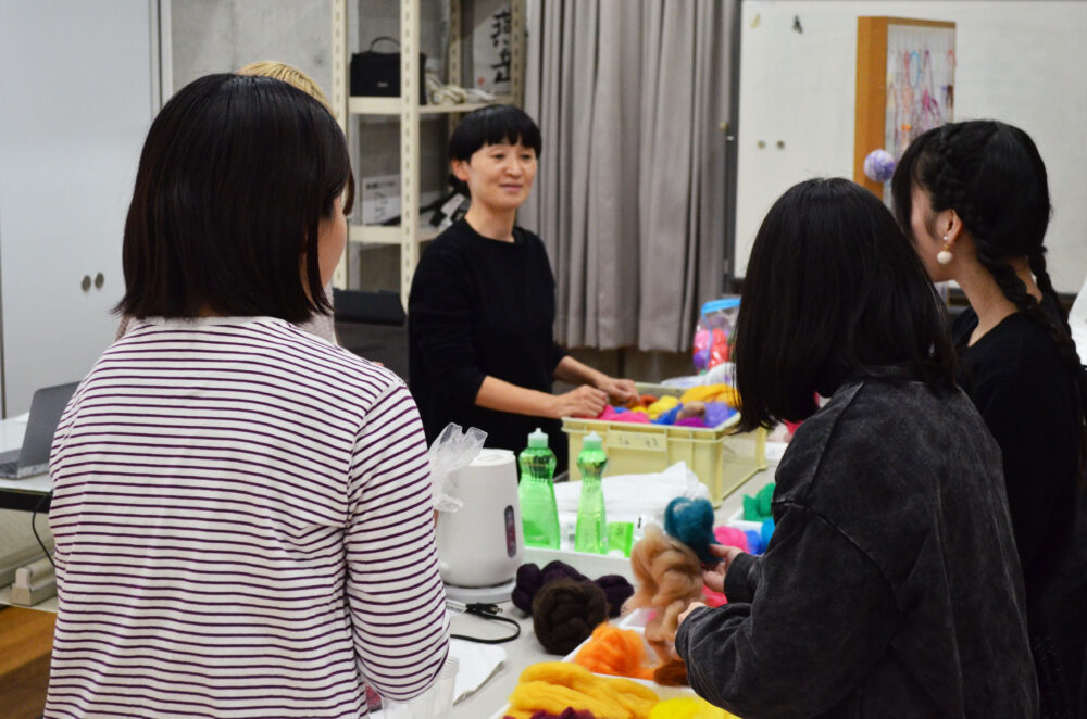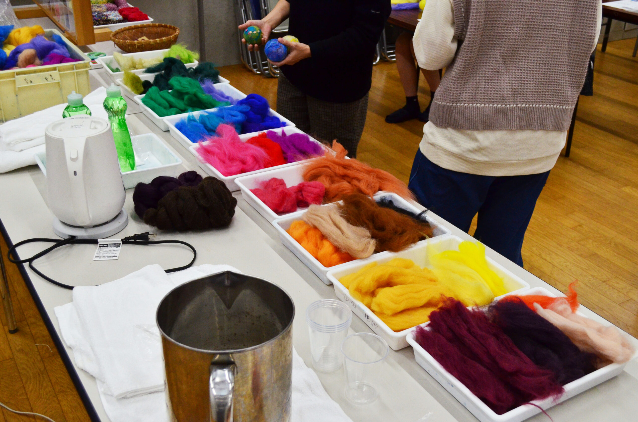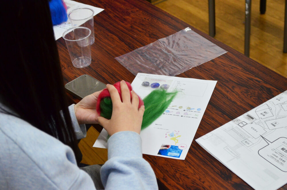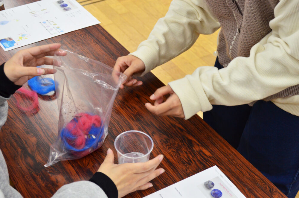 今回の授業では、水フェルトの技法、縮絨(しゅくじゅう)を使い、手のひらサイズのカラフルなオブジェを作りました。
