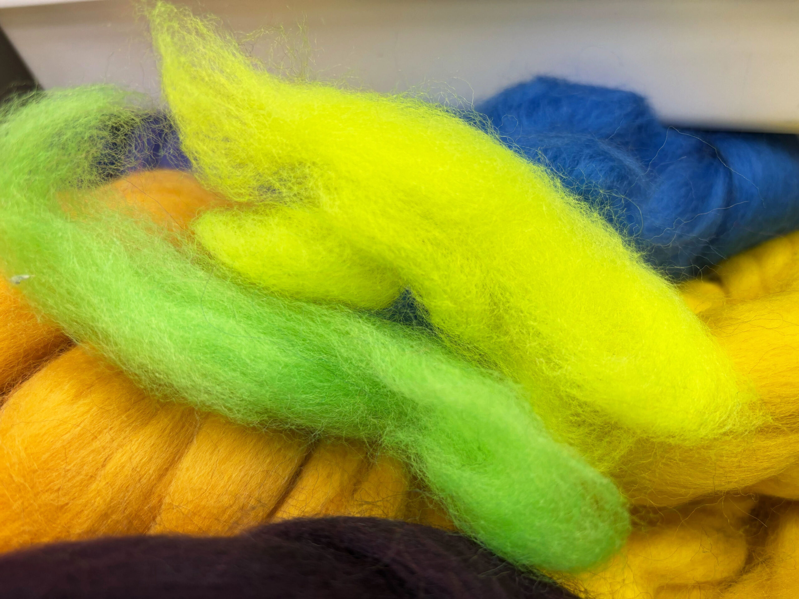 先生の前には色とりどりの羊の原毛(コリデール)が並んでいます✨