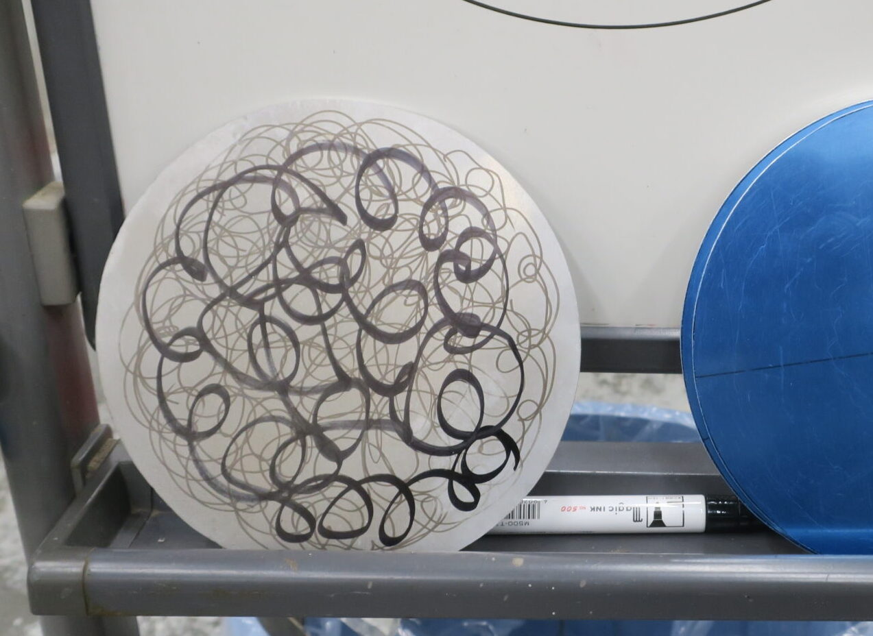 ハンマーで叩く前に、最初にアルミ板に黒色の油性ペンでぐるぐるの線を書いていきます。