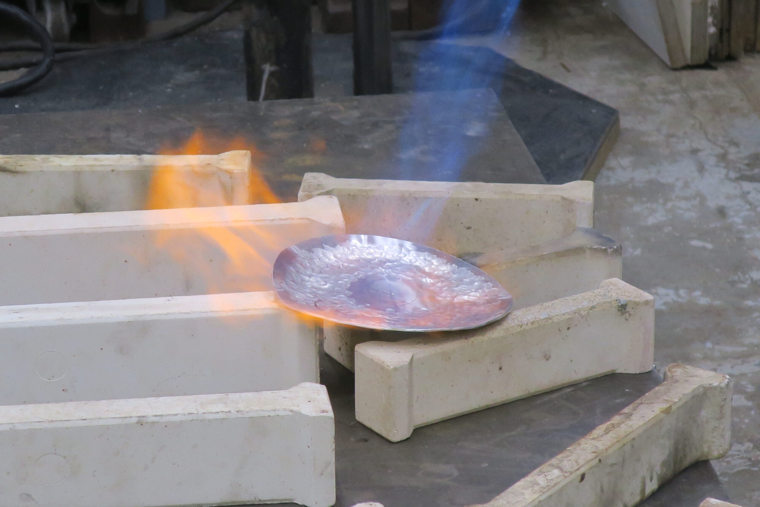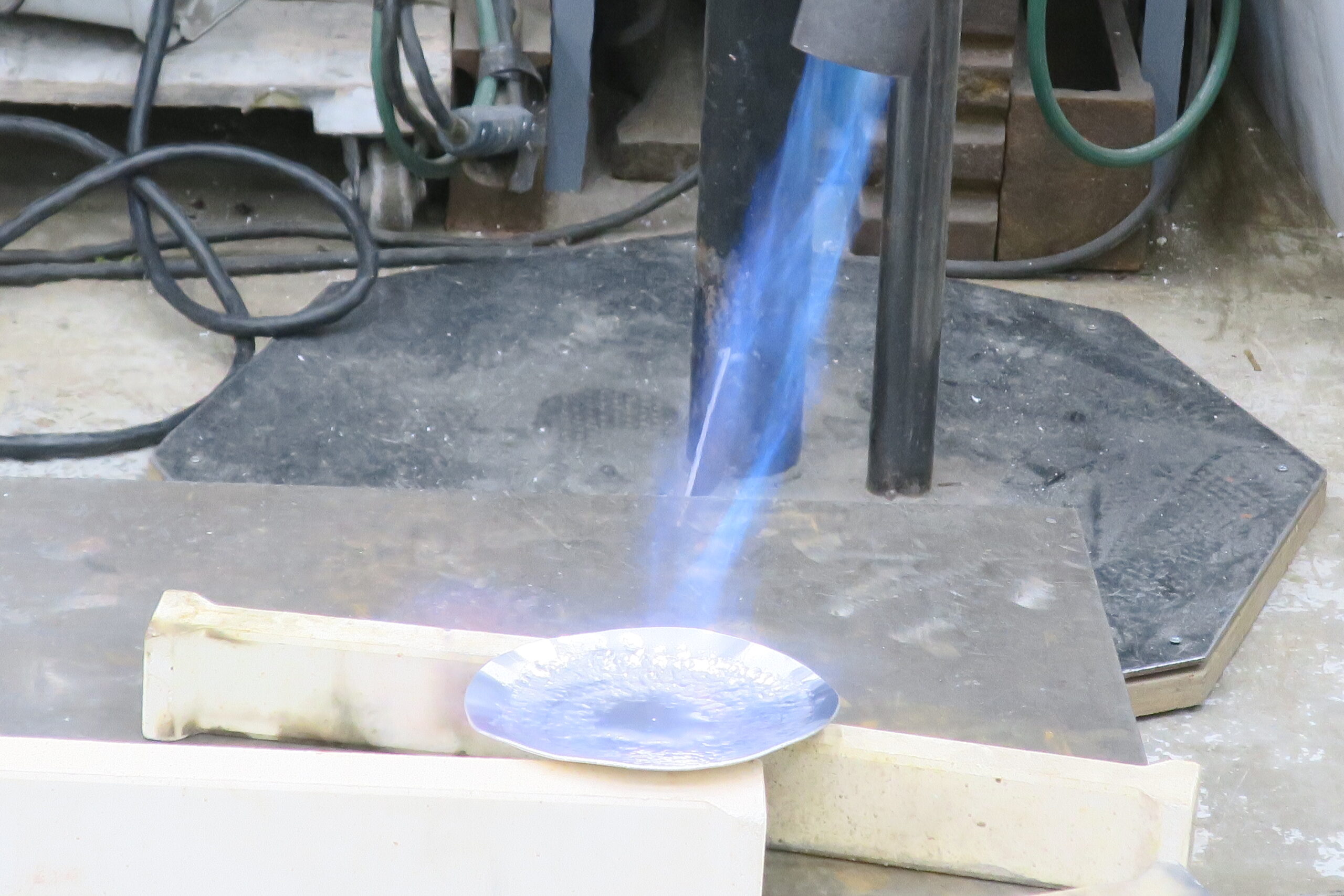 ハンマーでアルミ板を叩き、バーナーで焼き鈍して、ハンマーで叩く。をひたすら繰り返して形を叩きだしていきます!