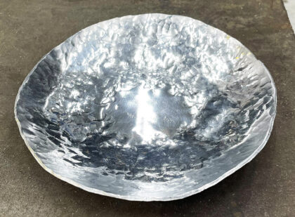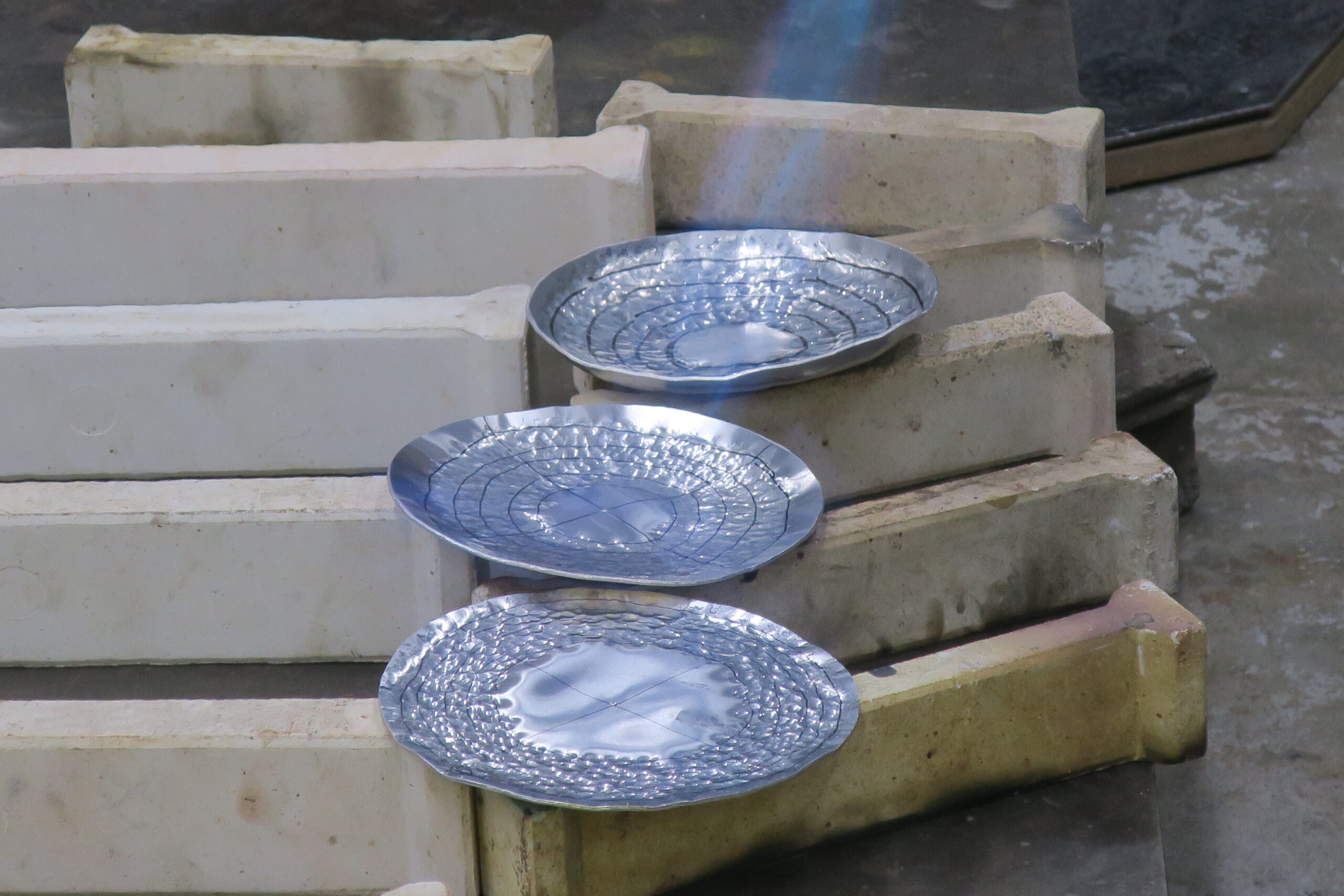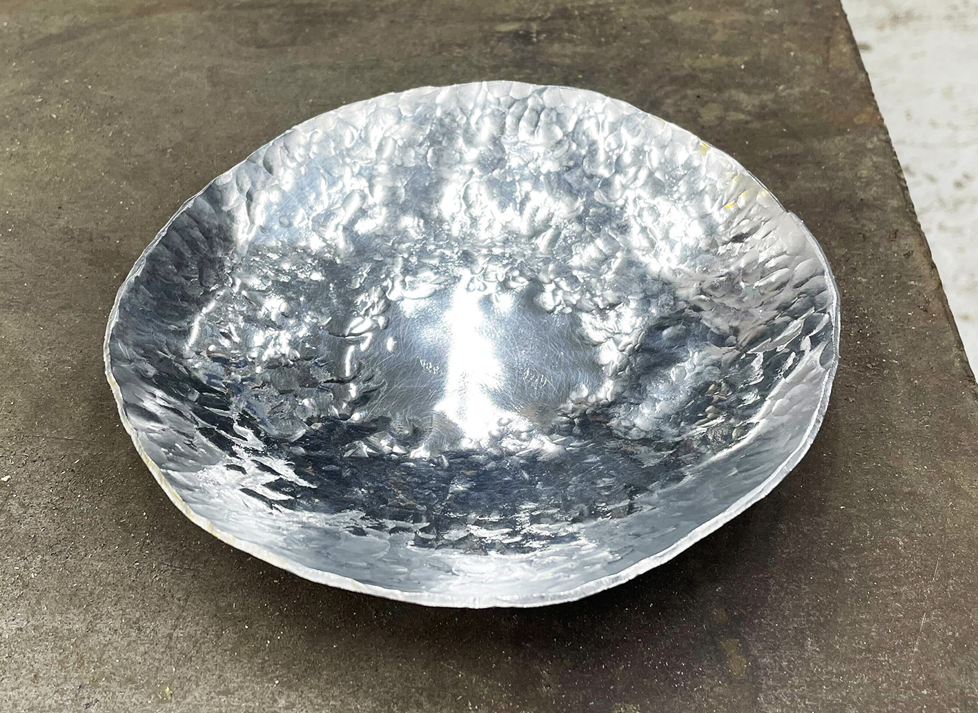 アルミ板をハンマーでひたすら叩くこと約1時間、平らな板だったものからお皿の形が生まれてきました!