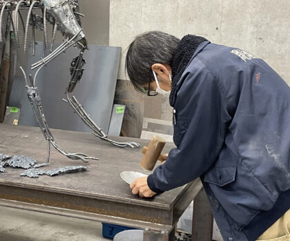 アルミ板をハンマーで叩きだす音が立体造形工房内に響きわたります!
