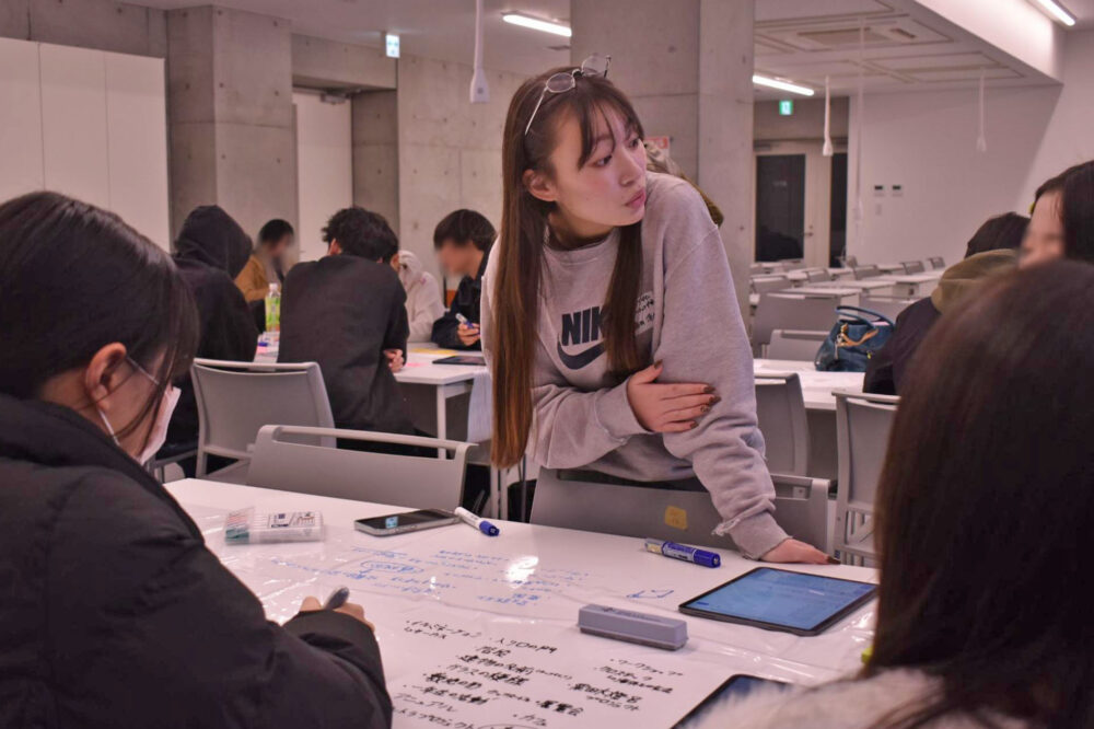 100分という限られた時間の中で、アイデアを出し、まとめ、さらに発表まで行うのはなかなかのハードワーク!ですが、みなさん一生懸命取り組んでくれました。学生スタッフも輪に入って、一緒にアイデアを練り上げる具体的なサポートをしてくれました。