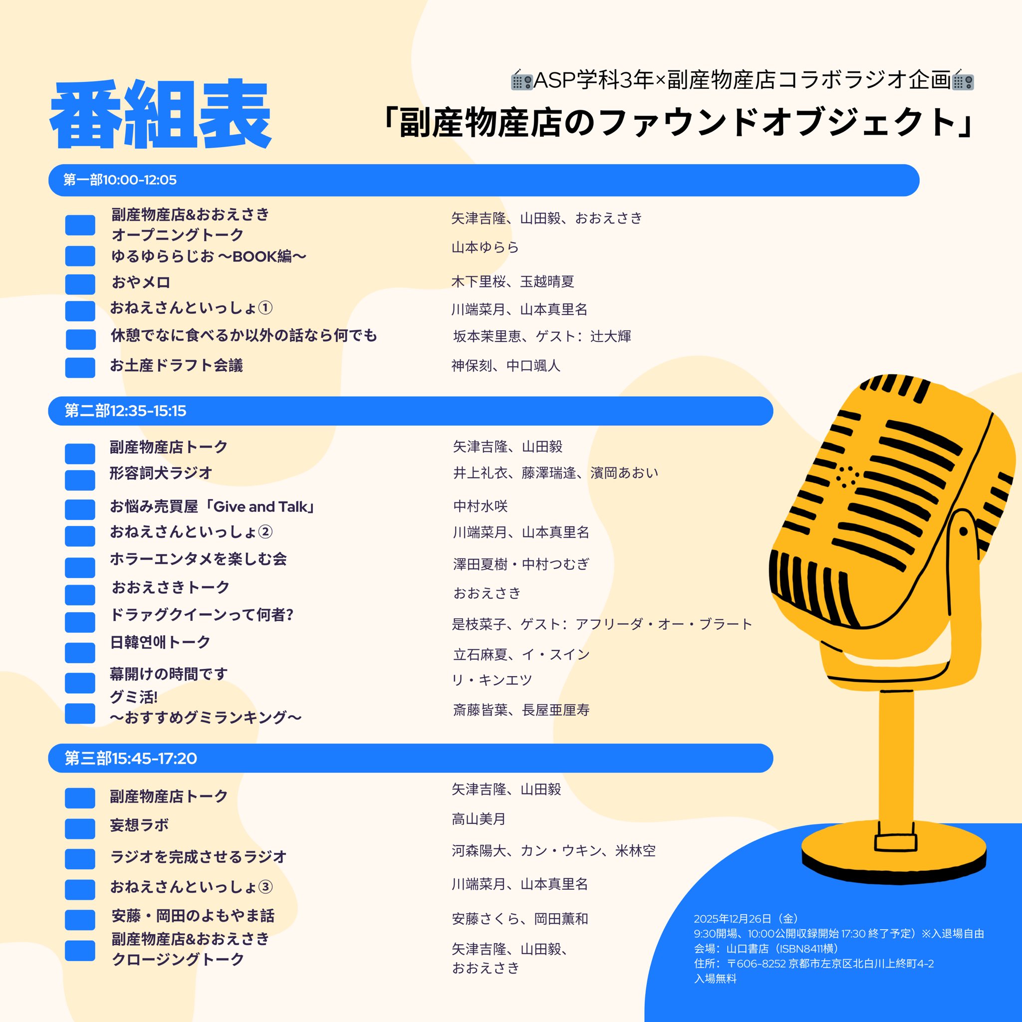 この度アートプロデュース学科3年生と副産物産店(矢津吉隆先生+山田毅先生)で、ラジオ番組「副産物産店のファウンドオブジェクト」を企画しました。