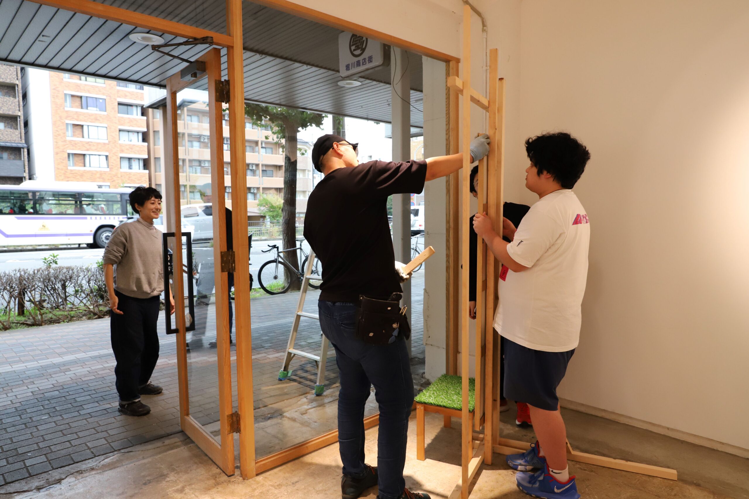 この授業を担当することが決まった当初から、スケジュール上、授業としても作家の私自身としても、会場の堀川地域と密な関係を事前に構築することは難しいとわかっていました。そのような外部の人間が、ただスペースをお借りして展覧会を行っても、堀川を生活の場とする方々にとっては、何の関心も持てない展示となると感じていました。そのため、学生のみなさんには、展示期間中に作品を積極的に展示空間から持ち出し、作品自体を出張・お散歩させて、かしこまった展示鑑賞だけにならないイベント(ある種押し売りな「おすそわけ」)を企画して欲しい、とお願いしました。