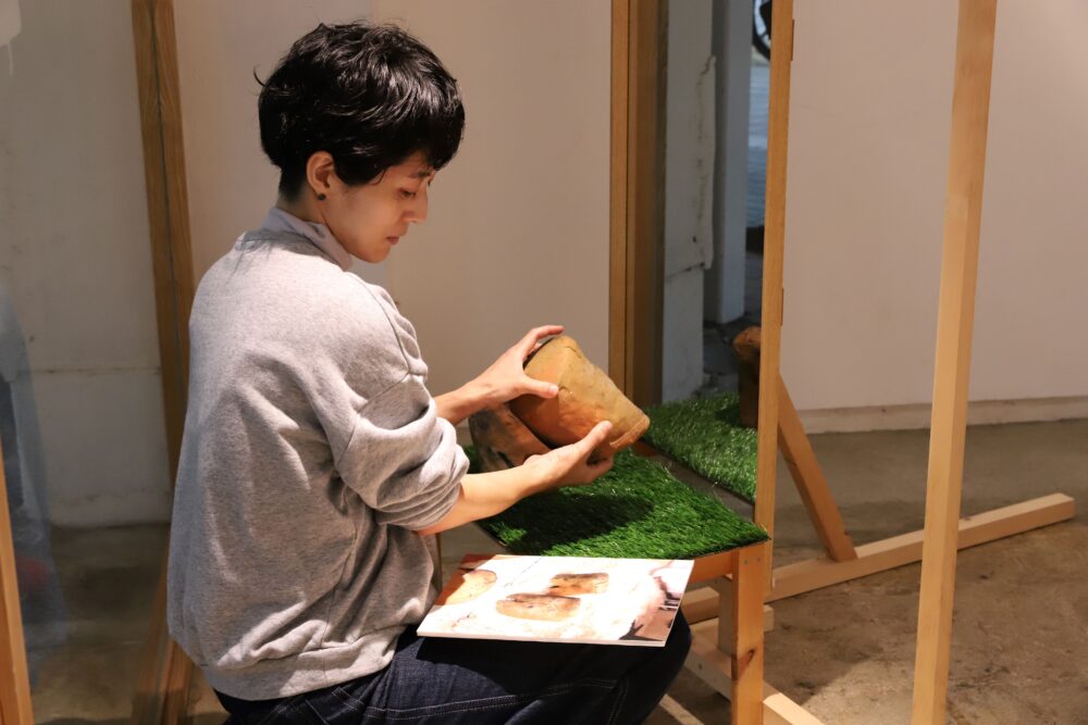 佃先生:私は自分の作品に愛着のある方の作家ではありますが、自分以外の方、今回は学生のみなさんが、作品と個人的な時間を過ごす中で、徐々に「少し遠い作品」から「愛着のあるいきもの」のようにを感覚を変化させていく様子を見るのはおもしろいなと思いました。作品を選ぶ目線も私とは異なるため、かなり前に作った作品も久しぶりに表に出していただき、作品を別の角度から見る機会にもなりました。