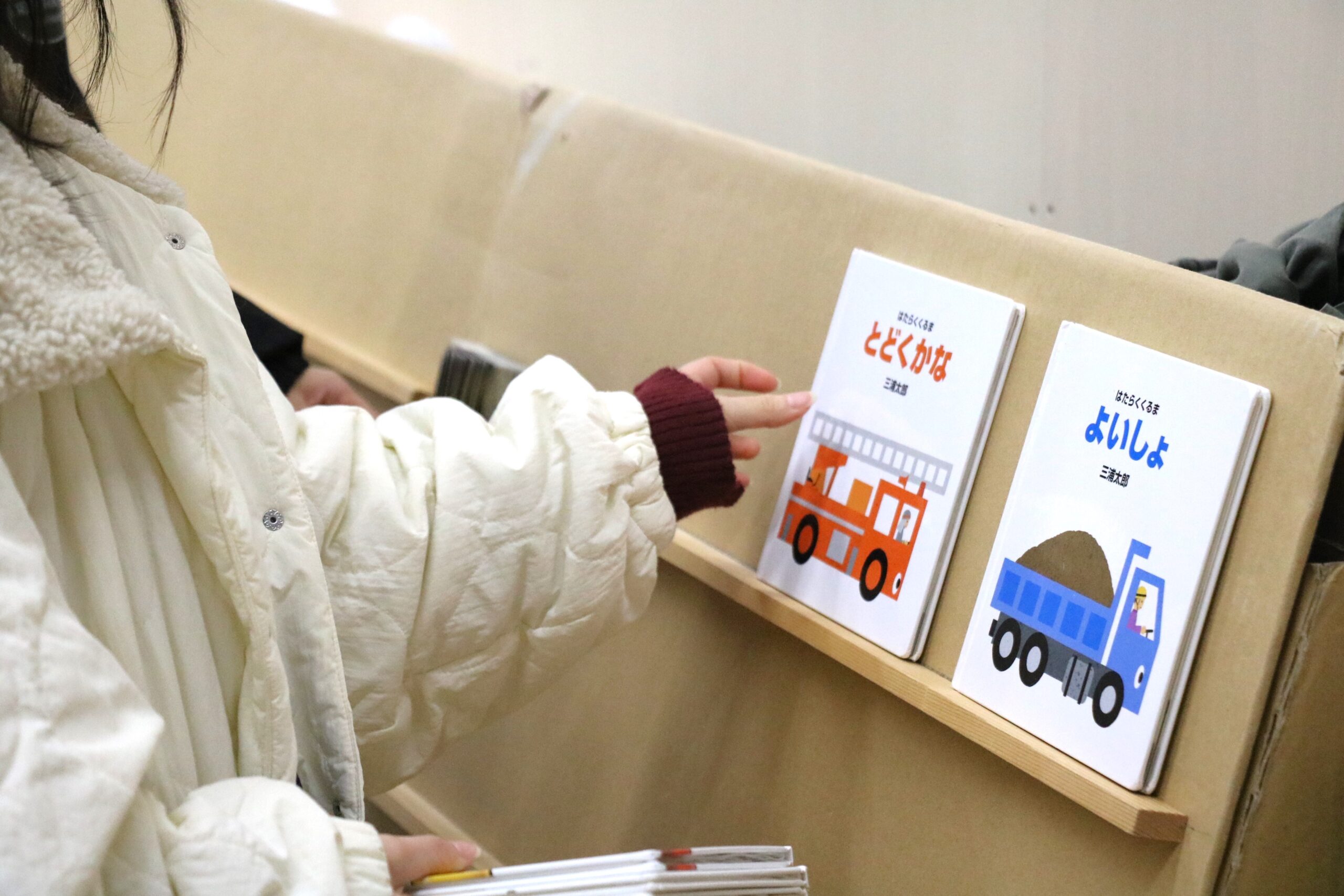 12個の面展台(表紙を見せて飾れる本棚)を組み立てて床に並べたり積んだりし、面展台に約120冊の絵本や本を並べていきます