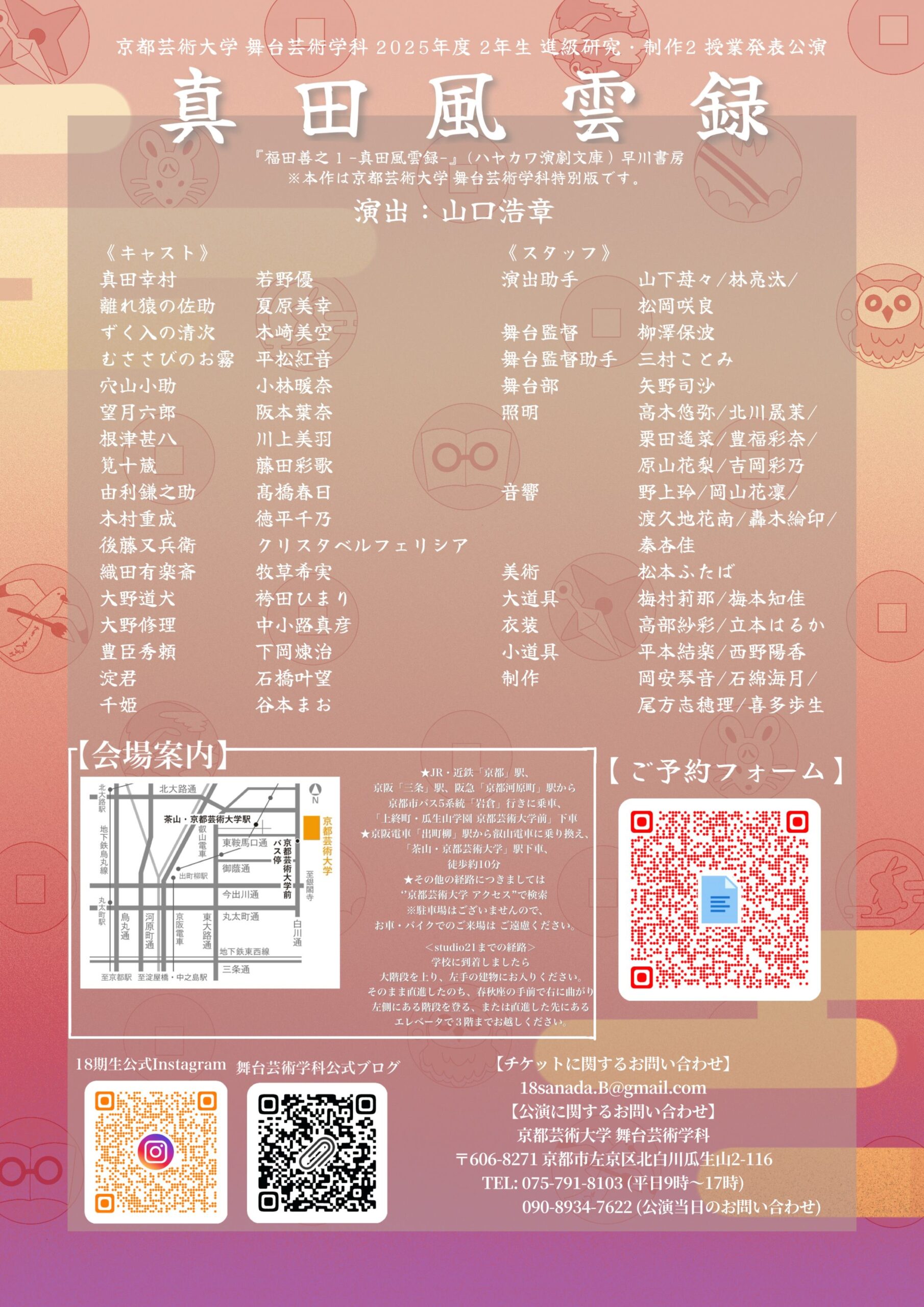 公演に関するお問い合わせ 京都芸術大学 舞台芸術学科〒606-8271 京都府京都市左京区北白川瓜生山2−116 TEL: 075−791−8103 (平日9時~17時) 090−8934−7622 (公演当日のお問い合わせ)ーーーーーーーーーーーーーーーーーーーーーーーーーーーーーーー<キャスト>真田幸村 若野優離れ猿の佐助 夏原美幸ずく入の清次 木崎美空むささびのお霧 平松紅音穴山小助 小林暖奈望月六郎 阪本葉奈根津甚八 川上美羽筧十蔵 藤田彩歌由利鎌之助 髙橋春日木村重成 徳平千乃後藤又兵衛 クリスタベルフェリシア織田有楽斎 牧草希実大野道犬 袴田ひまり大野修理 中小路真彦豊臣秀頼 下岡煉治淀君 石橋叶望千姫 谷本まお