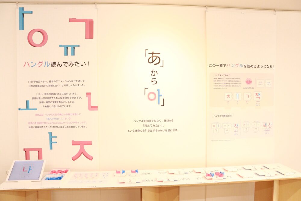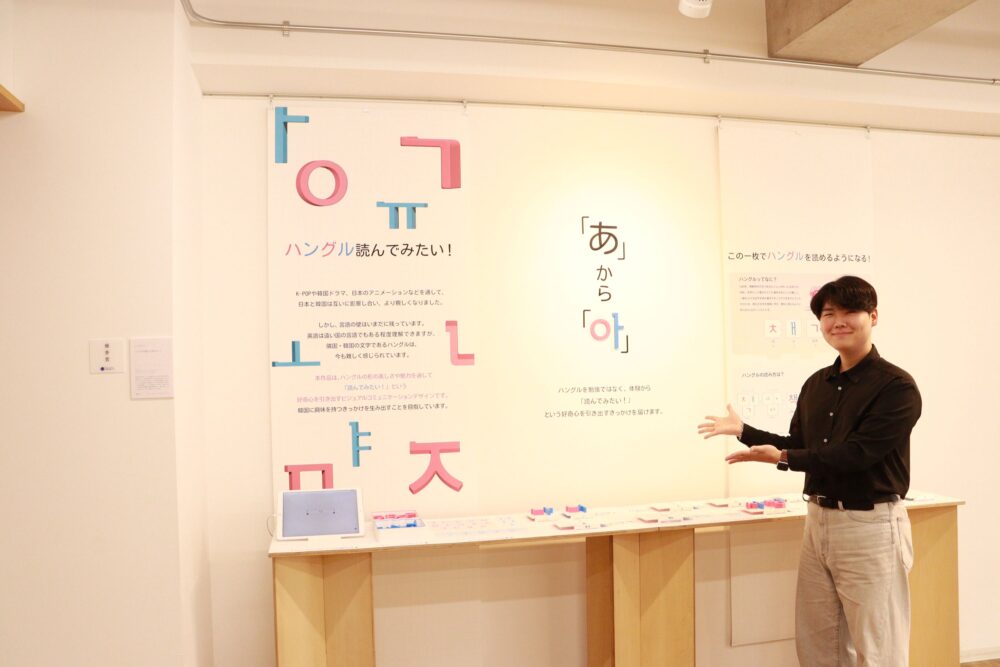 優秀賞をいただき、大変光栄に思います。ご指導くださった先生方、共に支えてくれた友人たち、そして多くの方々のご協力のおかげで、この場に立つことができました。心より感謝いたします。本作品は、隣国・韓国の文字であるハングルを紹介する作品です。留学生活を通して日本の友人や先生方と出会い、多くの人が韓国文化に関心を持ってくれていることを感じました。韓国語を学んだことがなくても、ドラマのセリフをきっかけに簡単な会話ができる場面に出会い、とても嬉しく思いました。意味が分からなくても読み書きができる英語とは異なり、地理的に近い韓国の文字は、まだ馴染みの薄い存在です。私は耳にしたことのあるドラマのセリフを入口に、ハングルがどのように作られ、表現されているのかを体験として伝えたいと考えました。本作品は、ハングルを「1から100」まで学ぶのではなく、「0から1」を体験することを目的としています。そのため、勉強ではなく体験として、デジタルではなくアナログで、平面ではなく立体的に制作しました。本作品を通して、ハングルを勉強ではなくコミュニケーションとして、「読んでみたい」と感じていただけたら嬉しいです。