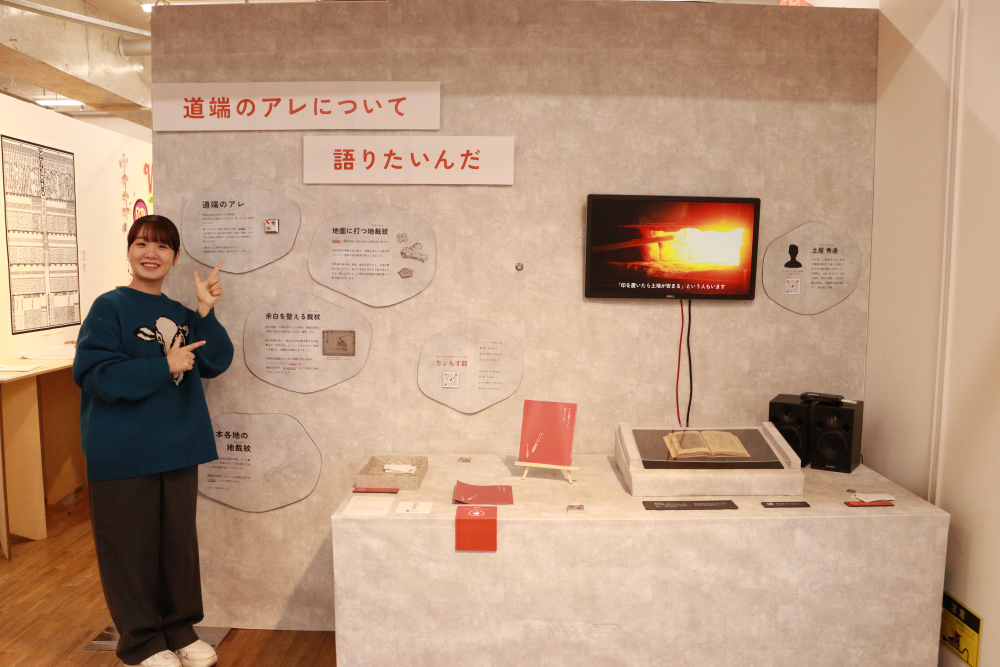当企画には3年時のプレ卒から取りかかり、この1年間は特にテーマの裏付けを意識しながら、設定や見せ方を練りに練り上げました。会期中、あっさり信じて帰る方や、仕掛けに気づいて驚く方など、狙い通り反応が分かれる様子を見てニヤニヤしています。