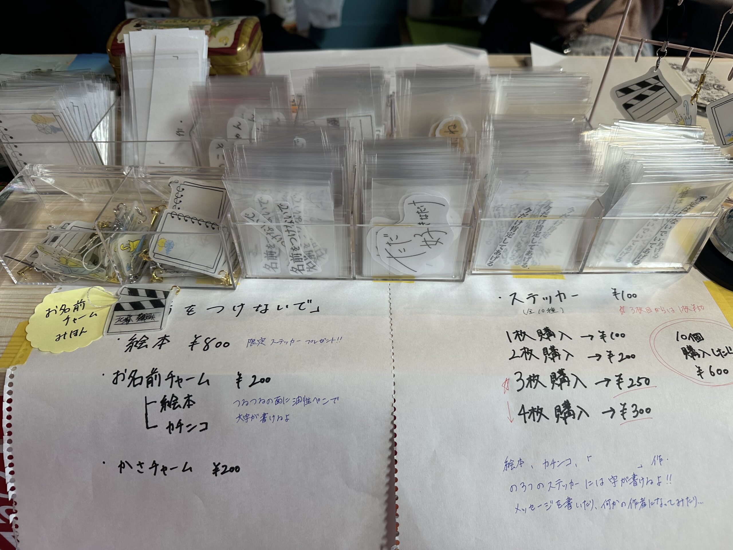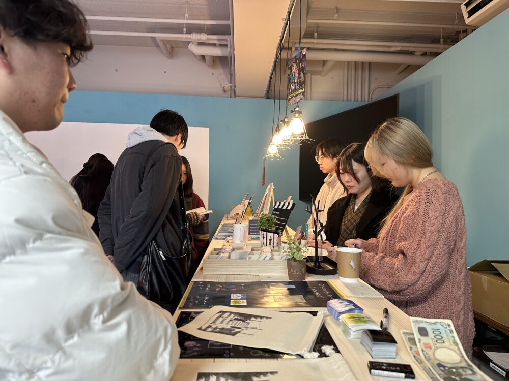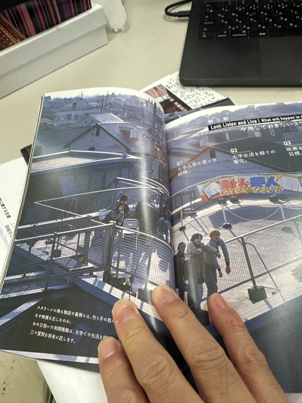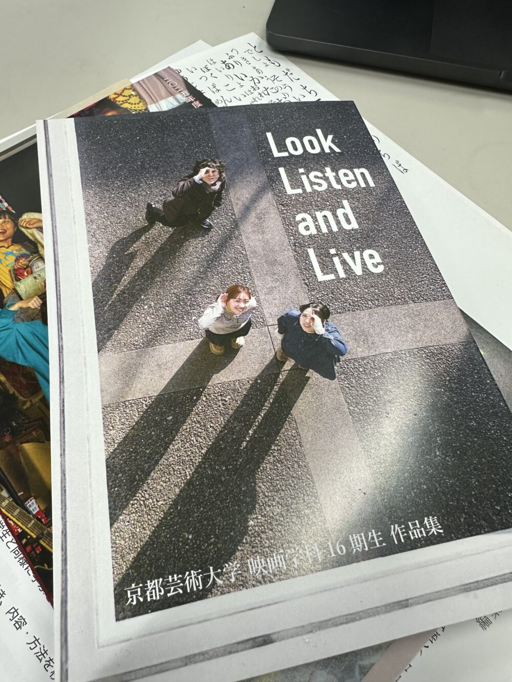 そんな物販の中でもひときわ目を引くのが総ページ数300ページ超の冊子「Look Listen and Live – 映画学科16期生 作品集」。卒制で執筆されたシナリオや、今回卒業する16期生がこれまで作ってきた映画の数々についての情報、更に各卒業生からのメッセージや対談が詰め込まれた充実の一冊。カラー版は3,000円、モノクロ版は1,800円。これ一冊で16期生の全てが分かります。
