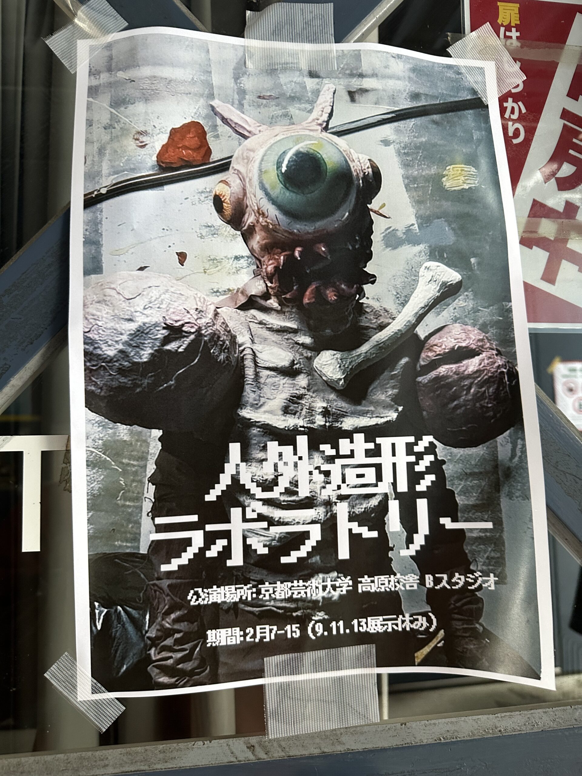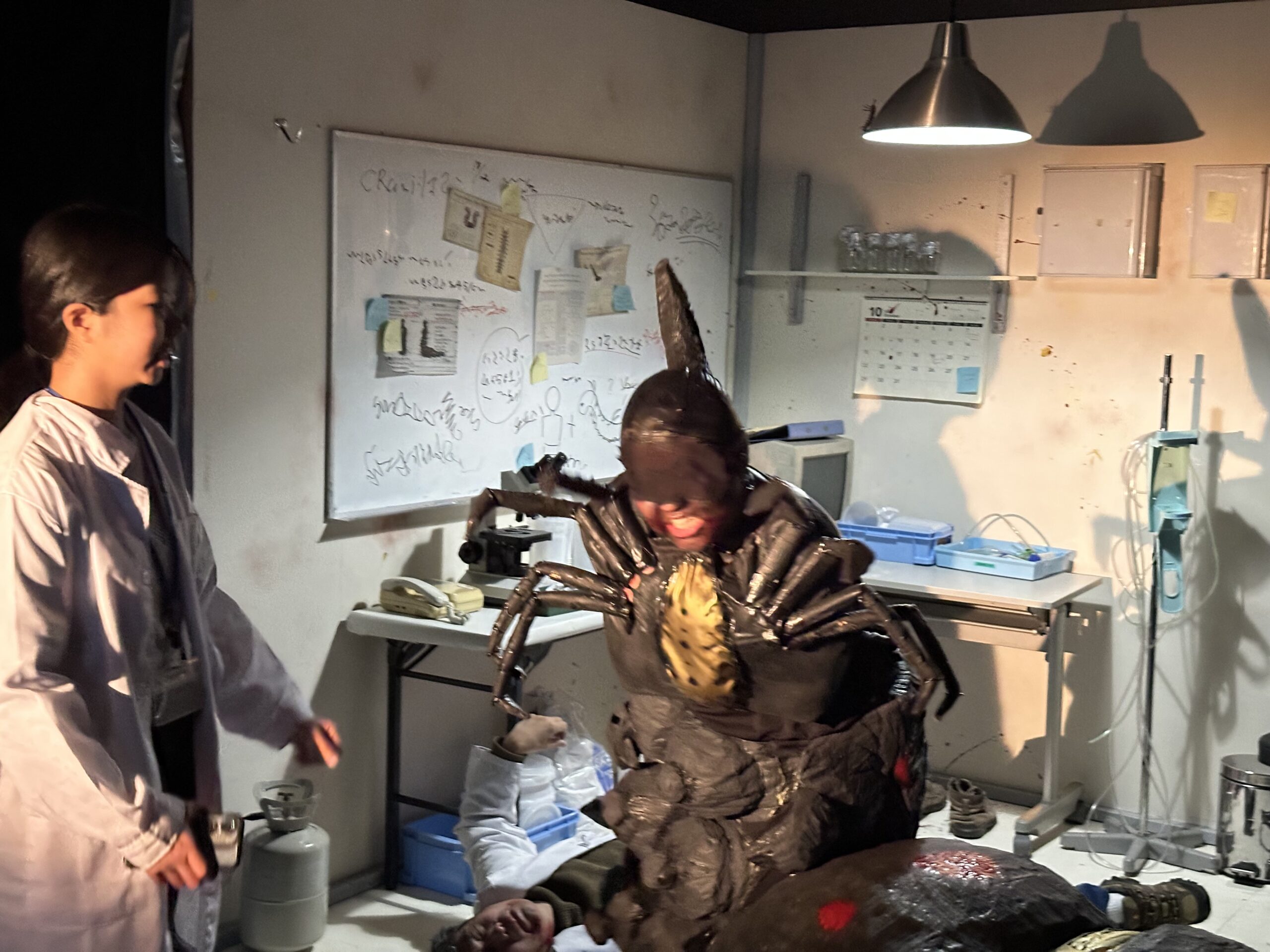 そしてAスタジオの隣のBスタジオでは「人外造形ラボラトリー」というインスタレーションを展示中。「人外」を生み出すための実験室が事故を起こして大変なことになっている、という設定で繰り広げられる、体験型インスタレーションです。映画の合間にぜひ肝試し的に挑戦してみてください!(こちらも映画学科の卒業制作作品です)