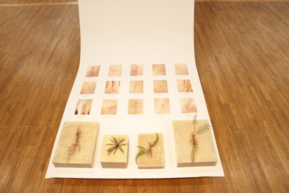 本作は、傷跡を欠落や脆さとしてではなく、自己を形づくる不可欠な要素として捉え直す試みです。二年前、このテーマについて思索を重ねる中、記憶は簡単に薄れてしまう一方で傷跡はその瞬間の記憶や感情を鮮明に呼び起こし、現在と過去が交わる場所となることに気が付きました。そして母の帝王切開の傷跡が、それらが単なる跡ではなく、記憶であり、強さであり、生きた証である確信へと変えました。 人は誰しもさまざまな傷跡を抱えています。コンクリートに根を張る植物のように、傷は不完全な場所にこそ居場所を見つけ再生し、身体と記憶の奥で静かに息づいています。卒業制作期間を通して、多くの傷跡と向き合い、その美しさを改めて確認することができました。 デザイン学科として挑戦的な制作に取り組み、想いを卒業制作として形にしたものを、多くの方にご覧いただき、このような賞を頂けたこと、心より嬉しく思います。本当にありがとうございました。制作に関わってくださったすべての方々、そして身体に傷跡を残し私を育ててくれた母へ、感謝の気持ちを込めて。この作品が、誰かの傷跡を愛するきっかけとなりますように。