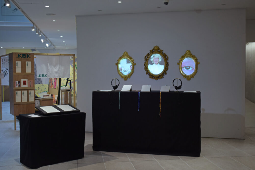 会話を撮った映像そのままで見せないということがこだわりです。白雪姫のお話に出てくる鏡をイメージして展示を構成しています。真ん中の鏡には一緒にお話しした方のパーティーメイク(派手なメイク)の姿でコンプレックスやメイクに関する話の抜き出した部分を再演しています。喋りに合わせて口元を動かすリップシンクという手法を用いています。左は実際の対話が行われていた状況の映像です。右はコンプレックスの部分を切り抜いた映像です。映像それぞれは鏡の枠のサイズに切り抜いており、ピッタリの大きさでプロジェクター投影できるようにミリ単位で調整しています。後輩の八尾小百合さんが協力をしてくれてこの形にすることができました。