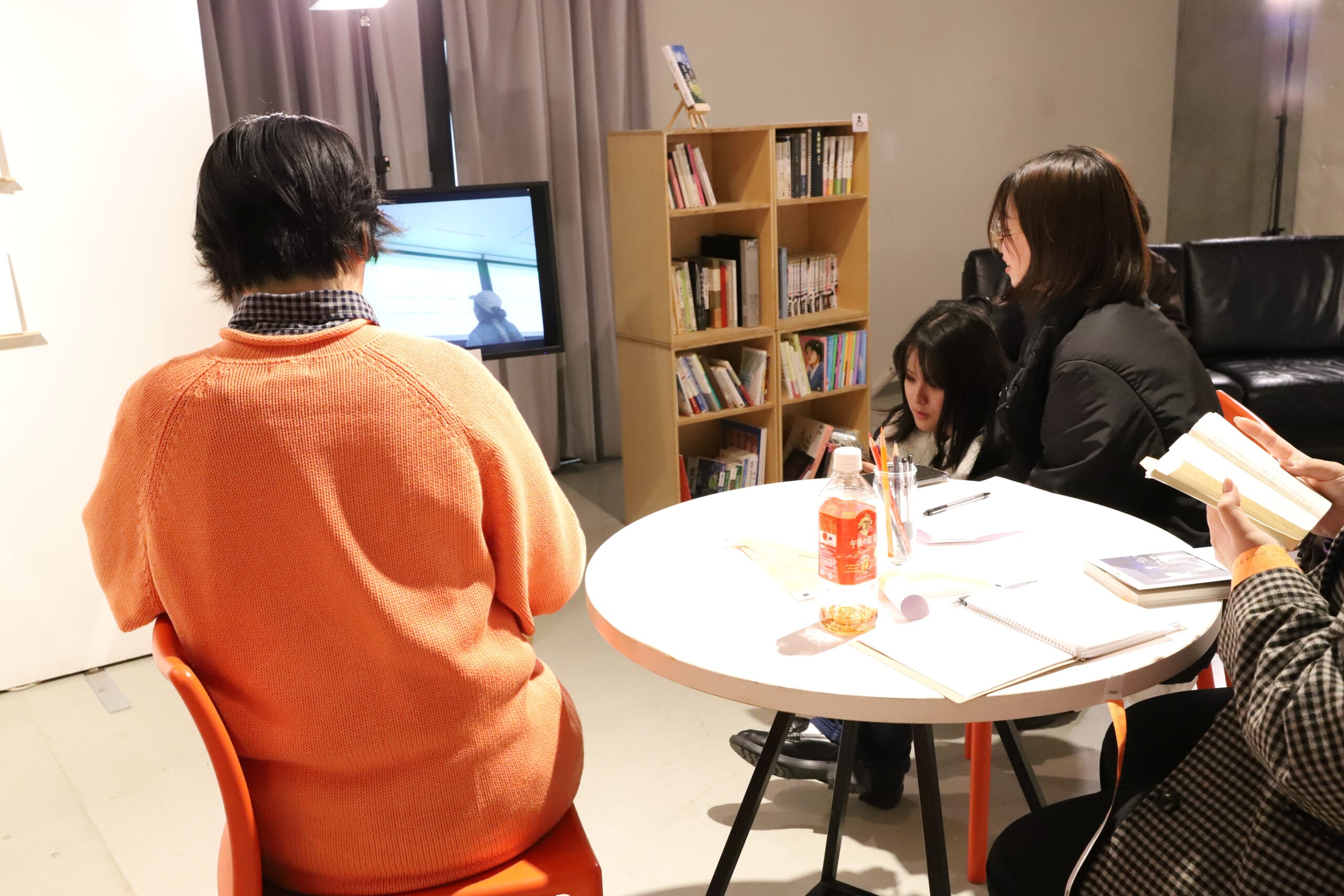 展示会場でも発表会の様子をモニターで中継(見守る4年生たち)