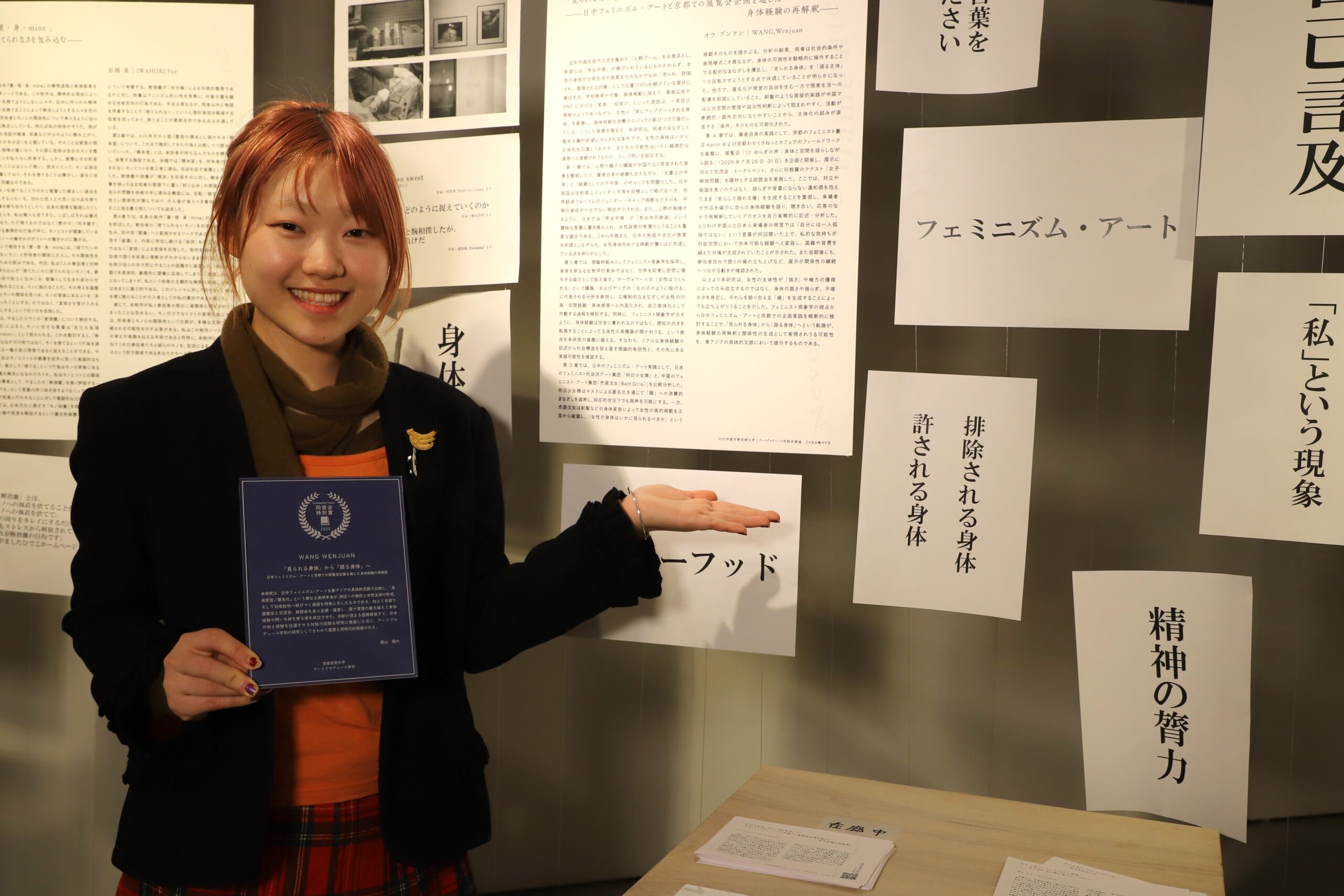 本研究は、日中フェミニズム・アートを東アジアの具体的文脈で比較し、「身体変容/匿名化」という異なる表現手法が、抑圧への抵抗と女性主体の形成、そして社会批判へ結びつく過程を明快に示したものである。加えて京都で展覧会と交流会、朗読会を自ら企画・運営し、国や言語の壁を越えて身体経験や問いを持ち寄る場を成立させた。分断が深まる国際環境下で、日中の知と経験を往還させる対話の回路を研究に実装した点に、アートプロデュース学科の研究としてきわめて重要な同時代的意義がある。