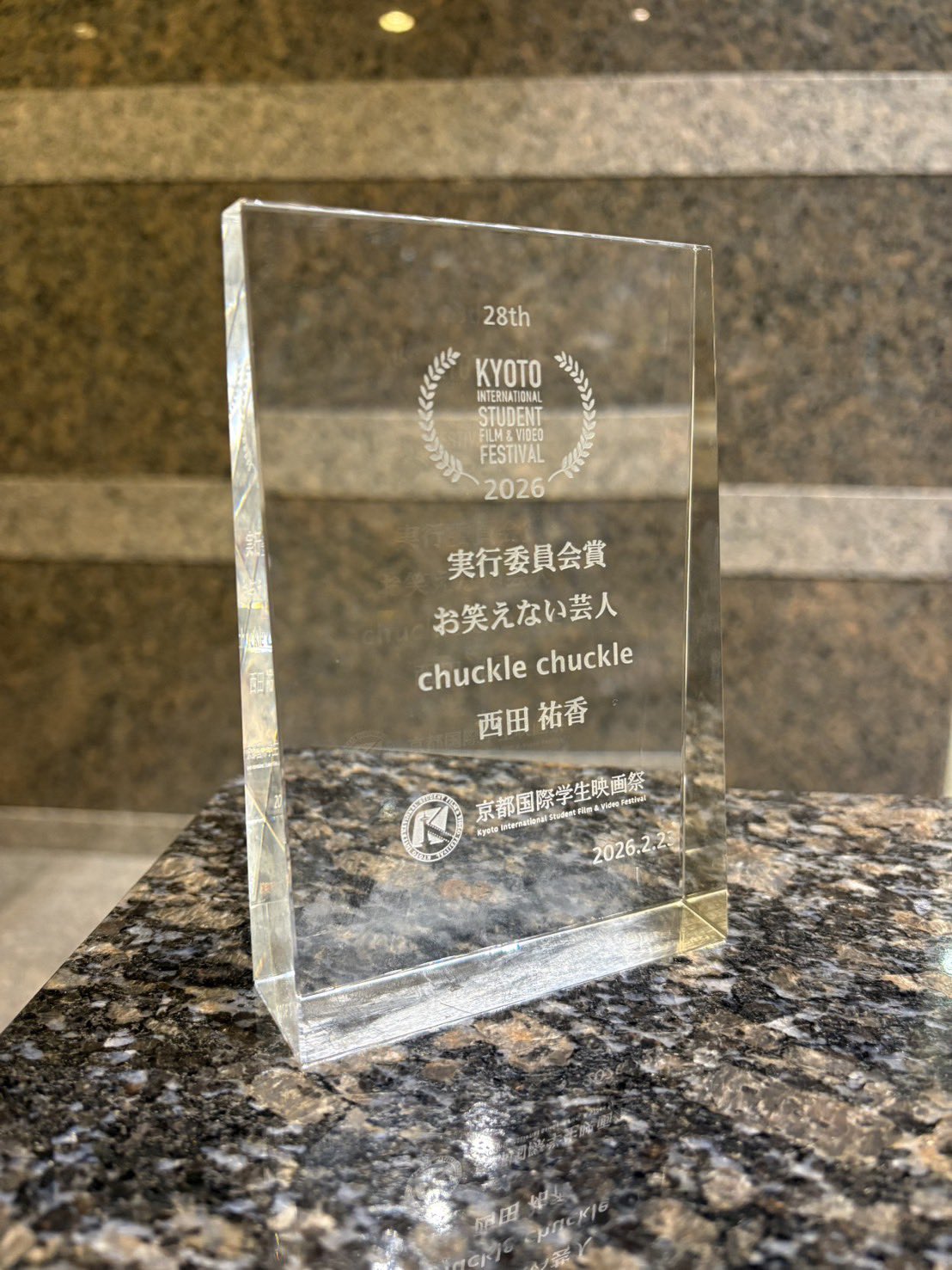 昨日行われた第28回京都国際学生映画祭の授賞式にて、2024年度期卒業制作作品『お笑えない芸人』(西田祐香監督(映画製作コース15期生))が、学生実行委員により選出される「実行委員会賞」を受賞。西田監督とキャストの北野七海さん、村山暁さんが賞状と盾を受け取りました!