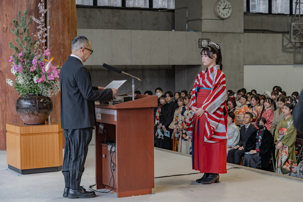 式典内の証書授与では、空間演出デザイン学科の代表として、瀬戸ましろさんが学長から賞状を受け取りました☺️