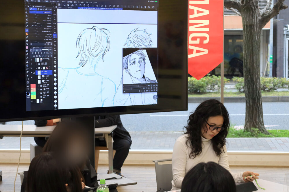 「ゲーム」「アニメーション」「イラストレーション」「CG」「マンガ」の5領域に分かれ、先輩たちが目の前で作品を作り上げる実演ブースです。制作のコツはもちろん、学生生活のリアルな話など、先輩と話し合いができる場になっていました。