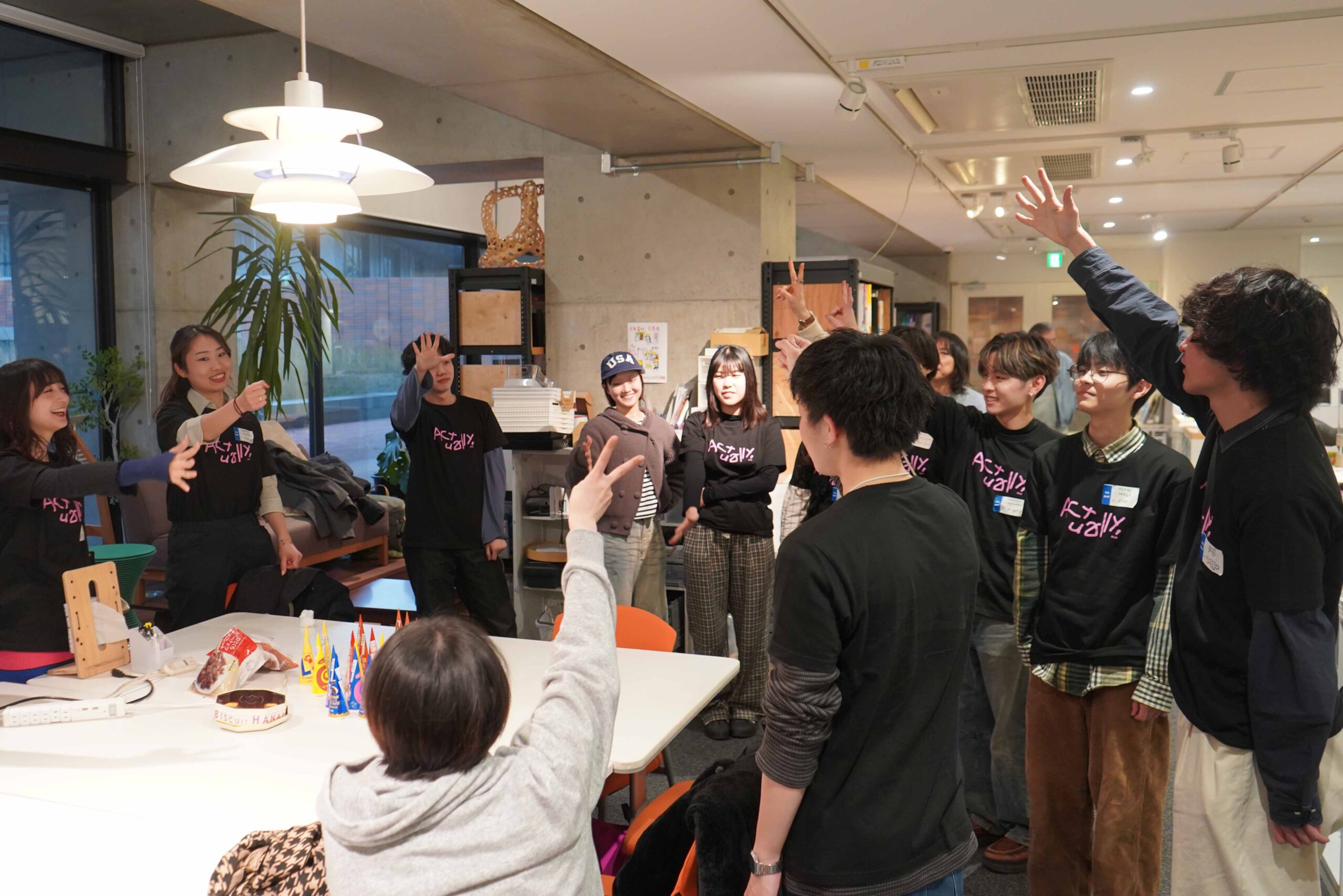 オープンキャンパスの撤収後、学生スタッフのみんなで、アイスをめぐってじゃんけん大会が行われました。