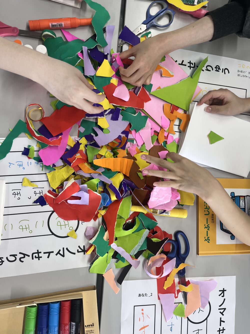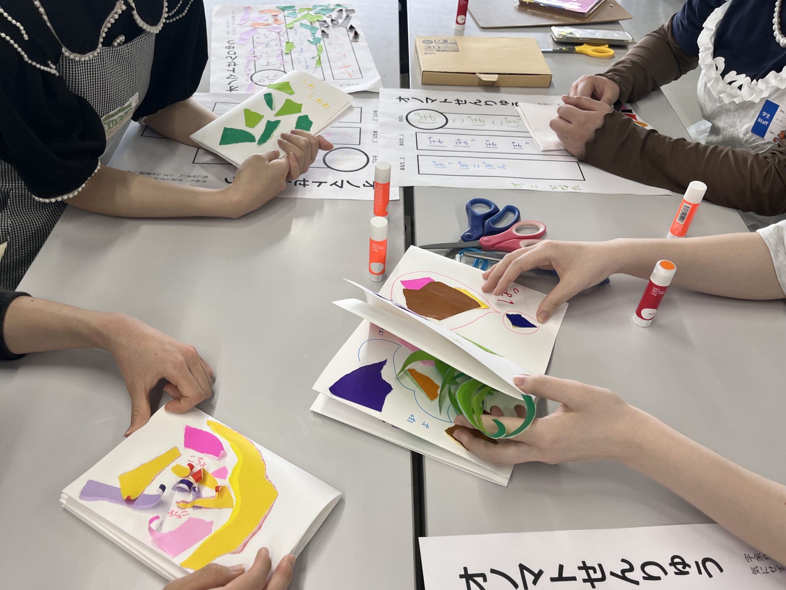 「リズムでつくる」と聞いて、歌ったり踊ったりすることを想像してしまいそうですが……今回は、折り紙でできた不思議なカタチと言葉の組み合わせであそんだり、ページ展開のリズム感を考えたりする絵本づくりの授業です👀