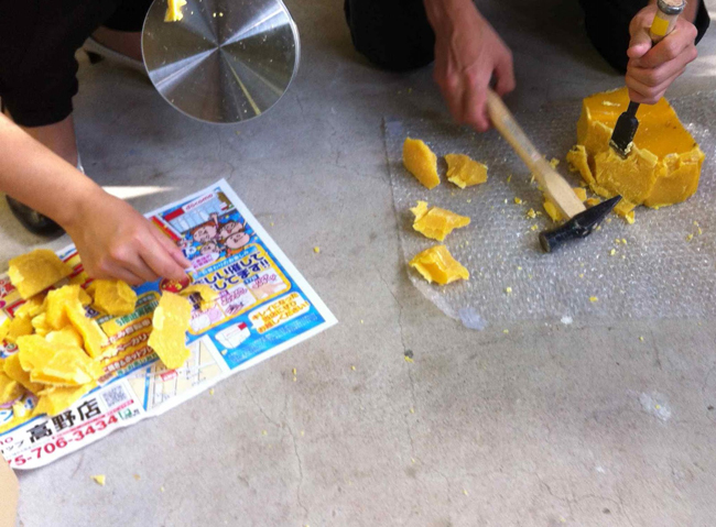 写真はクレヨンの素材として欠くことができないもの。大きな塊を細かくするために、ノミとカナヅチを使って砕いているところです。これ、なんだか解りますか?