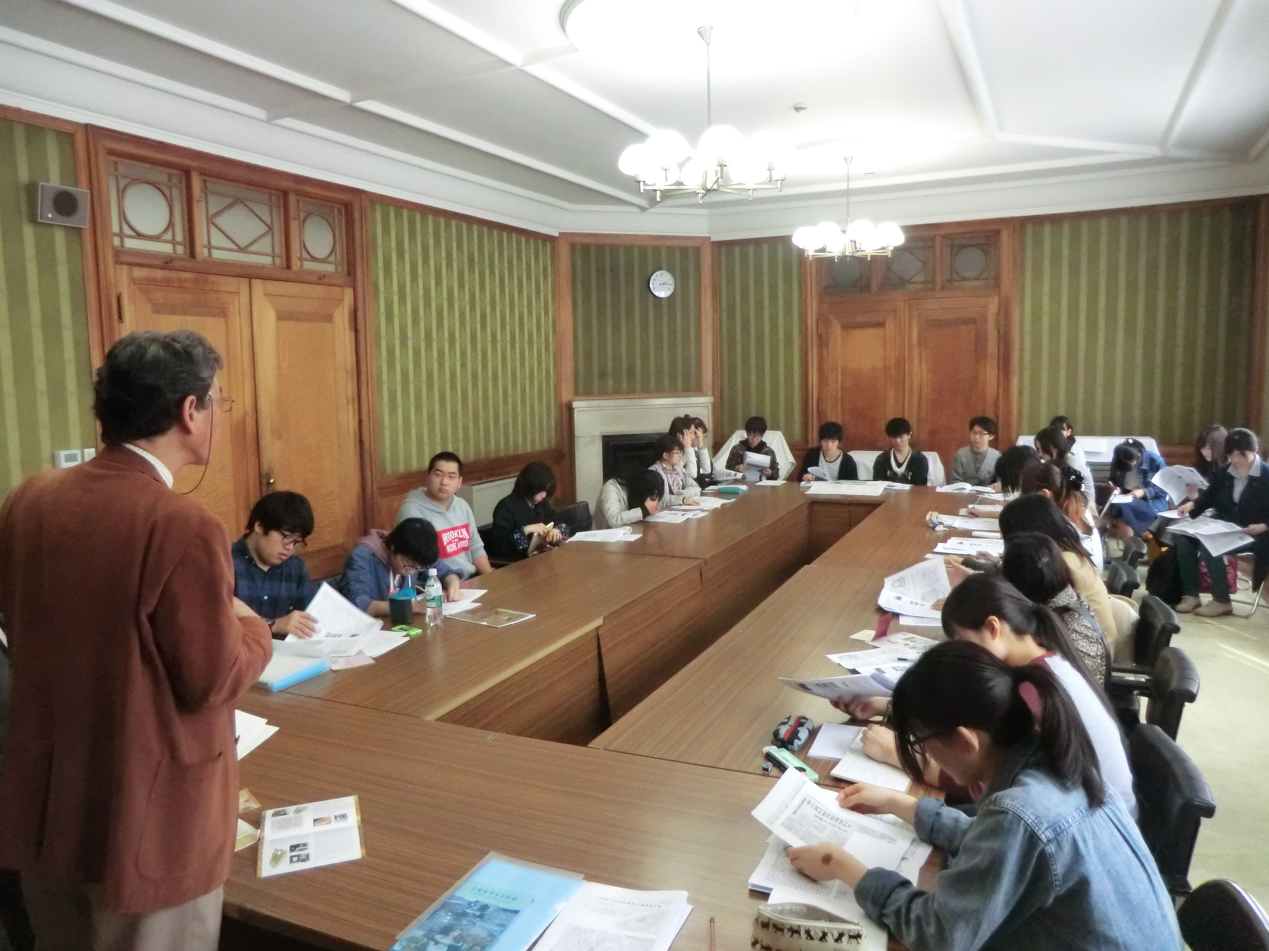 実は4月10日(金)が最初の授業でしたが、あいにくの雨で教室内での講義となりました。この日は8月16日の送り火で有名な大文字山(正式には如意ケ嶽)に登り、京都盆地を一望しつつ京都の地形を観察し、また山中にかつてあった山岳寺院「如意寺」の遺跡を探訪する予定でしたが、5月に延期となりました。