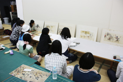 絵が完成したら、次は表装の生地を自分たちで買いにいきます。