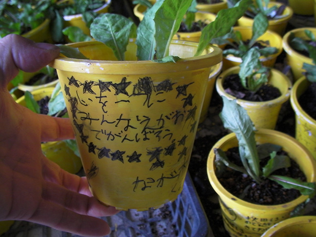 この黄色い鉢植えは、秋田県大館市の長木小学校の全校児童が黄色く塗り、しあわせの黄色い鉢に生まれ変わらせたものです。この、しあわせの黄色い鉢は、村山が2008年に東京都墨田区の5つの児童館に働きかけて協力していただきはじまりました。だれもが、活力のある色彩の黄色と緑の癒しが合わさったこの黄色い鉢植えを見ると、しあわせな気持ちになるオリジナルの鉢植えとしています。この写真は、東日本大震災で被災した宮城県石巻小学校の全校児童に、長木小学校で育てているとても希少な日本原種のえぞたんぽぽの苗を一人一鉢プレゼントする復興支援活動の時のものです。メッセージも書いて心のこもったものになり、また同じ東北に自生しているえぞたんぽぽを介しこども達の交流と、小さな芽から育つ植物と共に未来に向けて成長していけたらと言う願いもあるものでした。(2012年10月)