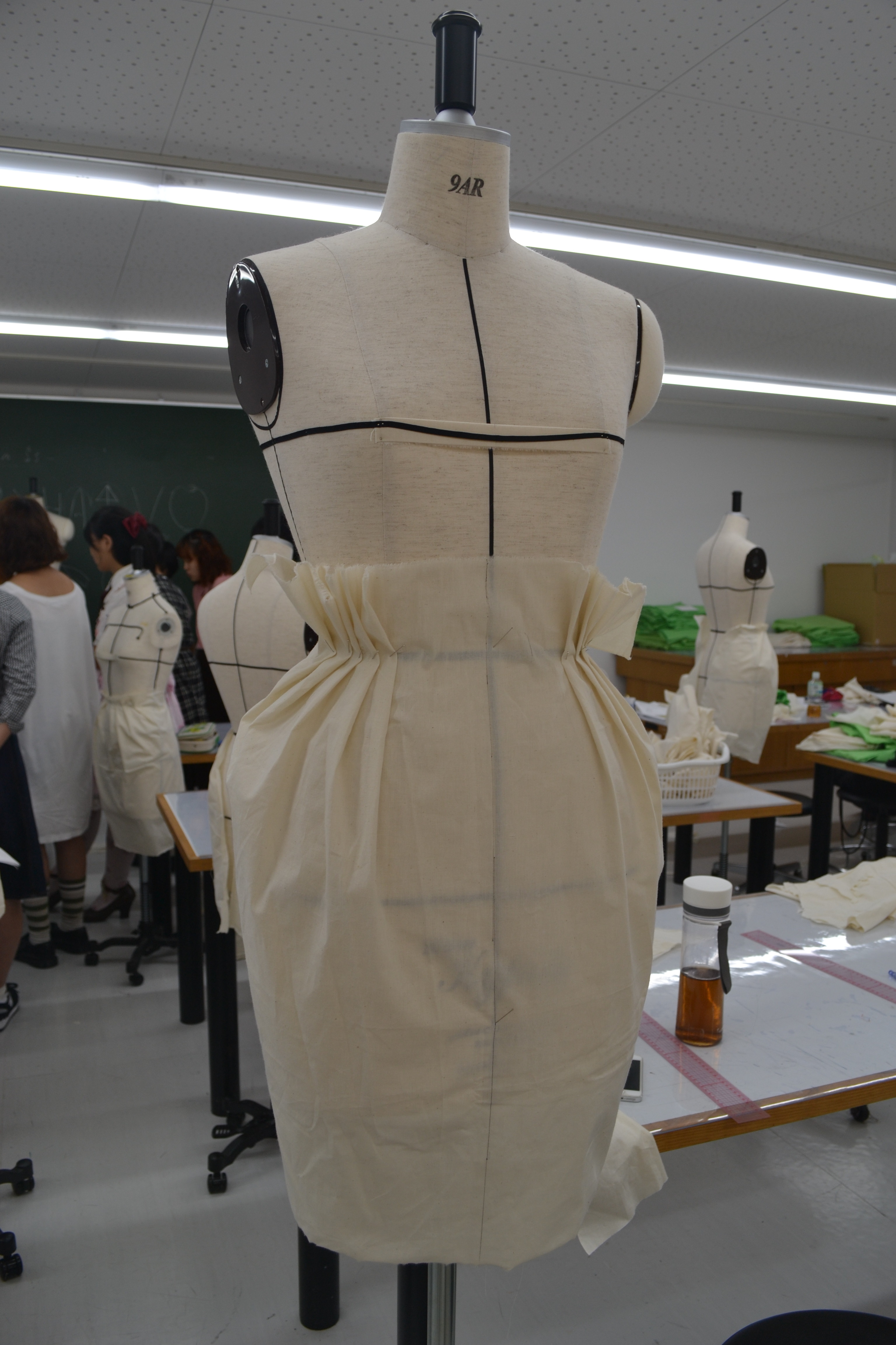 初日は無色のシーチングを使って立体裁断、ドレーピングを学びます。