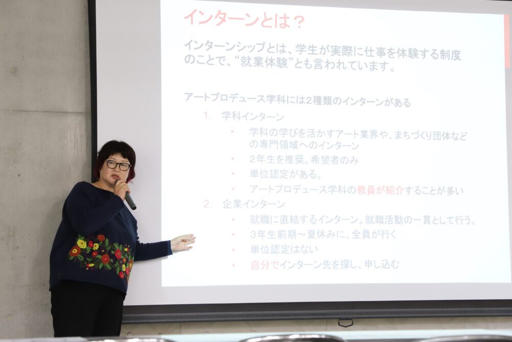 これからのアートは、「もの」ではなく“一回きり”な出来事の「経験」が主流となるというお話は、アートプロデュース学科で普段学んでいることに繋がるところがあり、また、1992年のアルベールビル冬季オリンピックの開会式の映像をもとにした「群衆」についての話も、日常と照らし合わせて共感する部分が多々あったようで、学生たちにとって非常に興味を掻き立てられる内容の講義でした。
