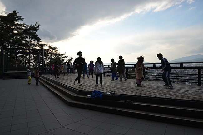 さて、室内の授業のあとは、千秋堂から歩いて30秒に位置する楽心荘で授業が行われました。ここも京都市内が一望出来る素晴らしい環境です。デッキがあり、このデッキで数名での鬼ごっこがスタートしました。とても俊敏に動きまわり、子どもにほんとかえっている感じでした。普段忘れている体の動き、感性、歓声を呼び覚まされていくようです。