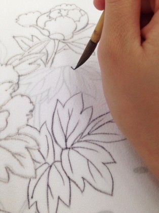 まず最初に見本を元に白生地に筆で写し取っていきます。
