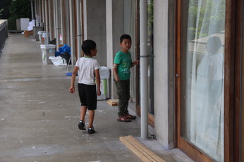 ある日、ベランダで育てているトマトに水遣りをしていたら、年長の男の子に「あそこになんかおる」と呼びかけられました。すると、ベランダの柵の隙間から1階にある人形のようなものが見えます。しかし、足らしきものしか見えません。そこで「よし、なんなのか正体を見に行こう」とちょっとした学内探検が静かにスタートしました。