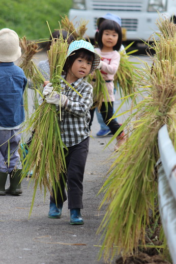 そんな、大きく育った稲を自分の手で刈り取り、お母さんに束ねてもらうと、干すために運びます。