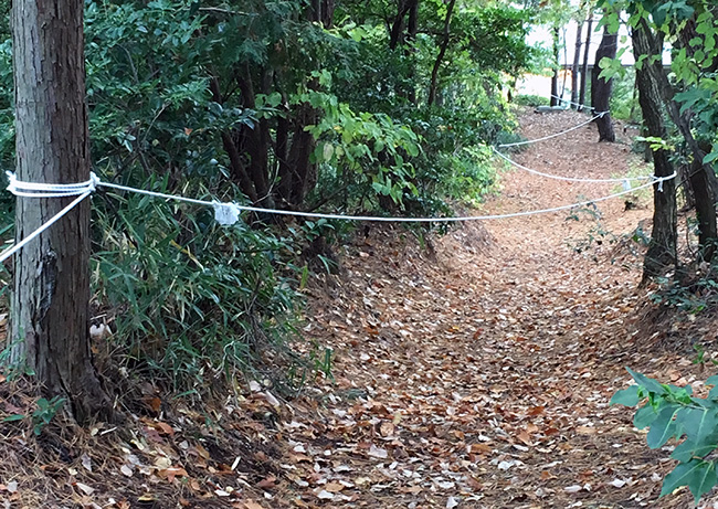 次は、瓜生山の自然部に入って行きますが、このロープは、教員の村山の作品です。体験型のもので、秋田や香川でのアートプロジェクトでも展示発表したものでもあります。タイトルは、「森の音」、「山の音」などで、目を閉じて手でロープを頼りに歩いて行き、いろんな感度を研ぎ澄ませて、自己の存在や様々な音や気配を感じ得て、数分後に目をあけて見る景色はきっと新たな世界が見えると言うものです。