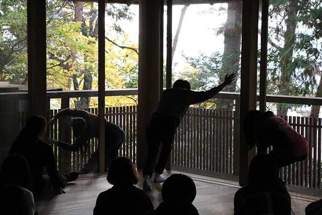 そして、こちらが大学の一番高い位置にある建物の千秋堂です。周りは木々に囲まれて素晴らしい環境です。まず、室内のここから身体の可能性や在り方などを、身体を動かしながら体感していきました。