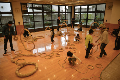 自然の藁やコモを使い沢山のわをつくり、水の波紋のような雨の雫のような自然の景を創造し床に置いたり、吊るしたりして展示を行いました。また、同時に自由にわであそびをつくってもらう内容で、ワークショップも実施しました。