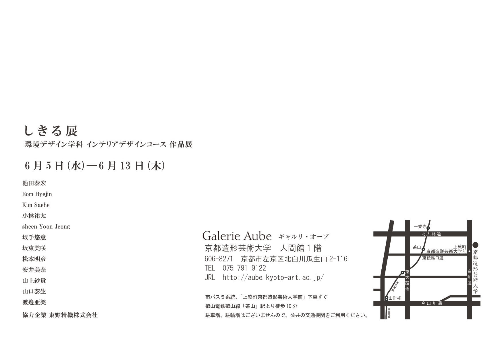 画像はDMの表面と裏面、そして会場設営中のひとコマ(左から渡邊さん、山上さん、池田さん、松本さん、そしてなぜか満面の笑みで混じっているのは建築コースの菊川さん)です。アルミフレームのディスプレイブースは東野精機(株)さんにご提供いただいています。