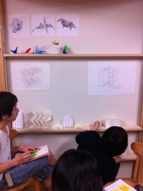 白い紙から折りたたみ可能な立体を作り、それを描くという課題でした。