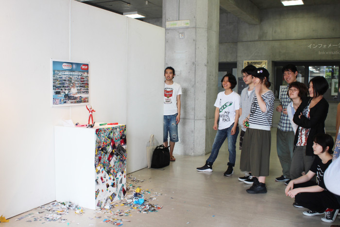 「流通」をテーマにした『流れ』、「生と性」を表現した『IN&OUT』など、各グループ独特な作品展を完成させ、展示の特徴、工夫した点、感想をなどを話し合いました!講師の福元先生とゲストの和田さんからは、「自分が感じる作品の魅力を発信するだけでなく、作り手であるアーティストや、鑑賞する人たちの視点に立ったうえで自分なりの空間作りを行うことが大切」というお言葉をいただきました。
