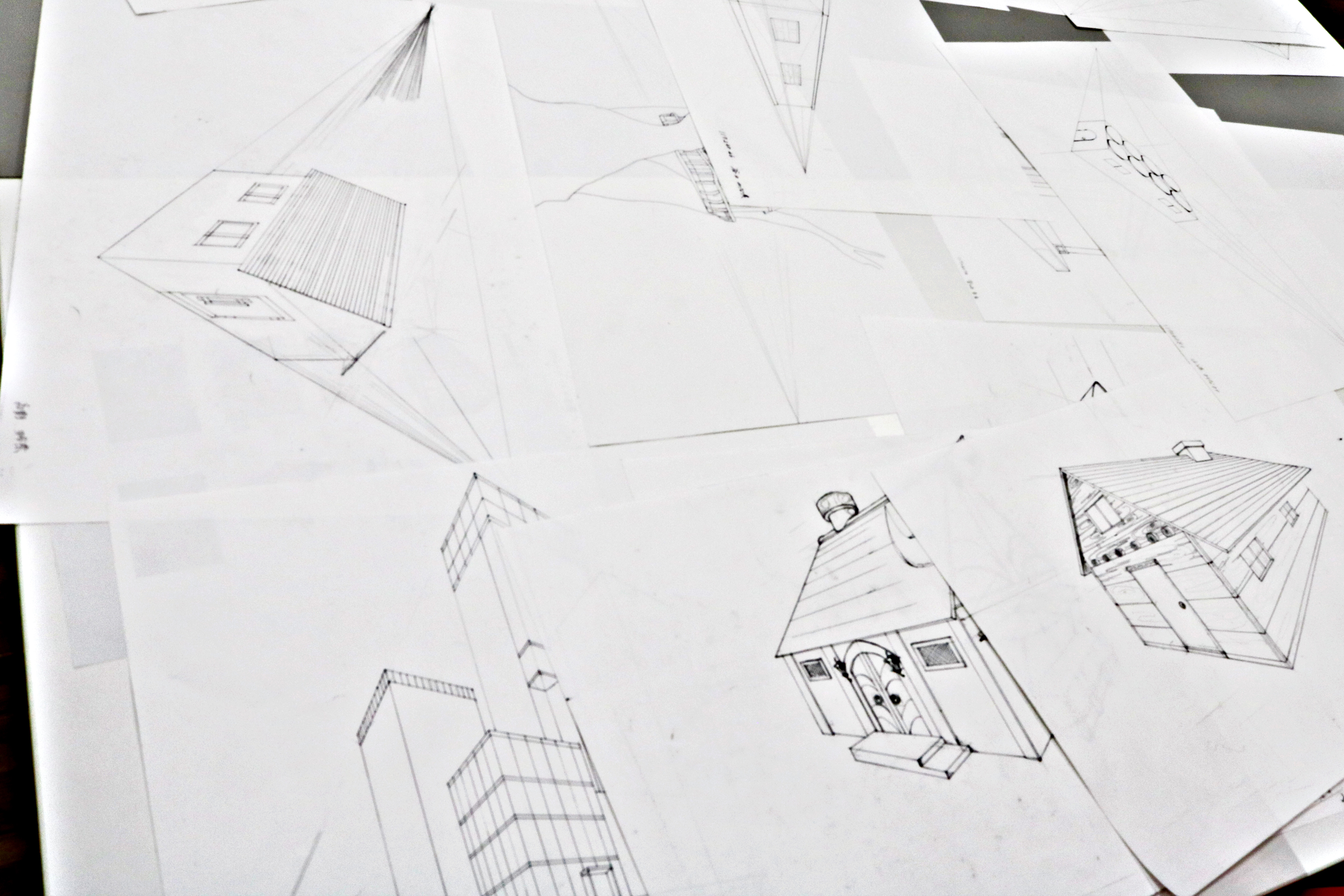 この日はパース技法の一つ「二点透視図法」を用いて、奥行きのある空間を作りました。