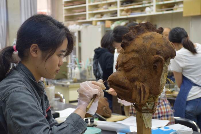 仏像技法研究家で本学客員教授 山崎隆之先生のご指導のもと、私たちは伎楽面、雅楽面、能面といったお面を「脱活乾漆」という技法を使って作っています。